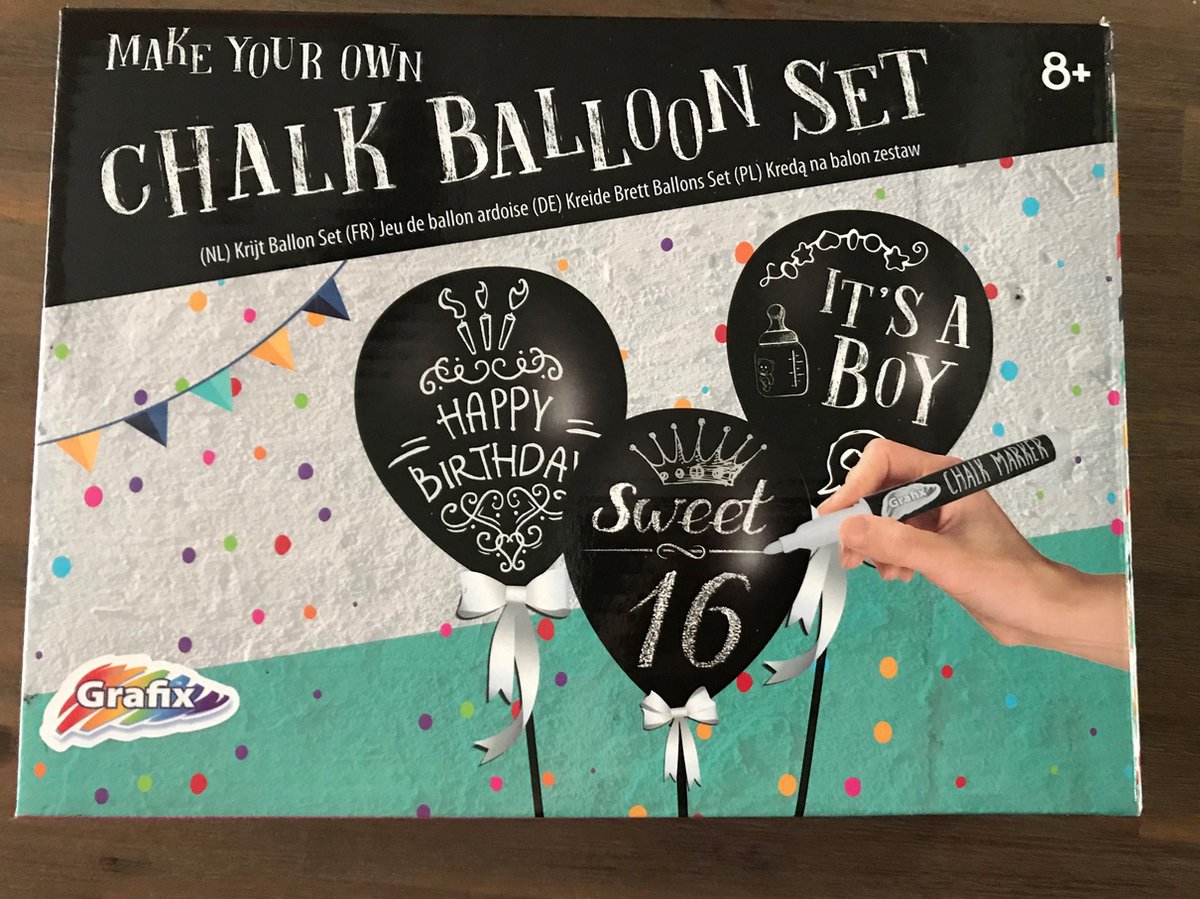 Deze set bevat 20 opblaasbare ballonnen, 20 stokjes, plakband en krijt. Afmetingen verpakking ca. 23 x 17 x 5,5 cm. Leeftijd 8+ Met deze set maak je leuke ballonnen met je eigen leuke boodschap.