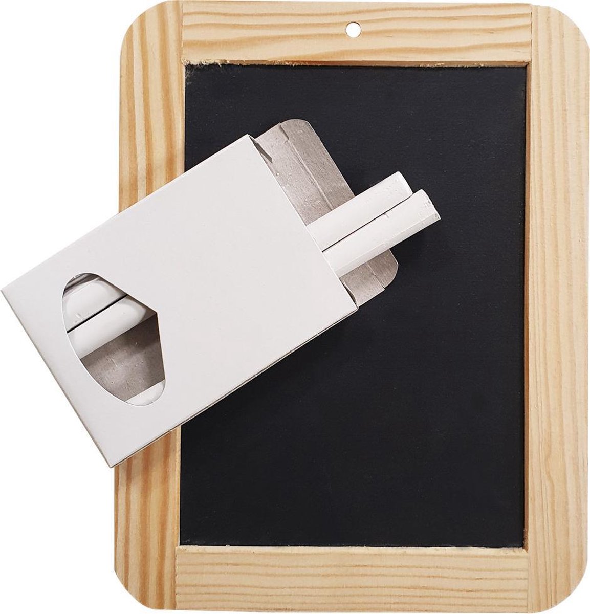 Krijtbord met houten rand, de buitenmaat is 14,7 x 19,1cm en binnenmaat is 10,7 x 15cm. In het smalle gedeelte zit een ophangoogje van 5mm. Er worden 6 krijtjes bij het leitje geleverd.