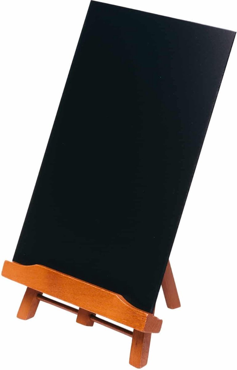Krijtbord op houten ezel. Geef makkelijk je suggestie aan! Schrijfbord is eenvoudig te reinigen met een zachte doek. Afmetingen: 21 x 30 cm formaat A4 Tableau noir sur un chevalet en bois. Faites facilement votre suggestion ! Le tableau d'écriture est facile à nettoyer avec un chiffon doux. Dimensions : 21 x 30 cm en format A4