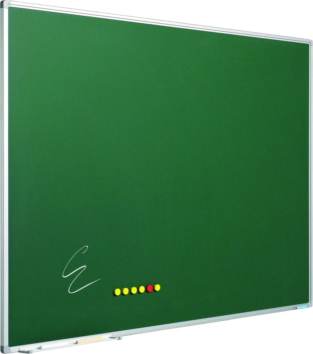 Krijtbord van groen of grijs geëmailleerd staal. Magneethoudend en uitwisbaar. Geanodiseerd aluminium softline profiel met kunststof grijze hoeken. Inclusief ophangmateriaal en afleggoot van 30 cm.