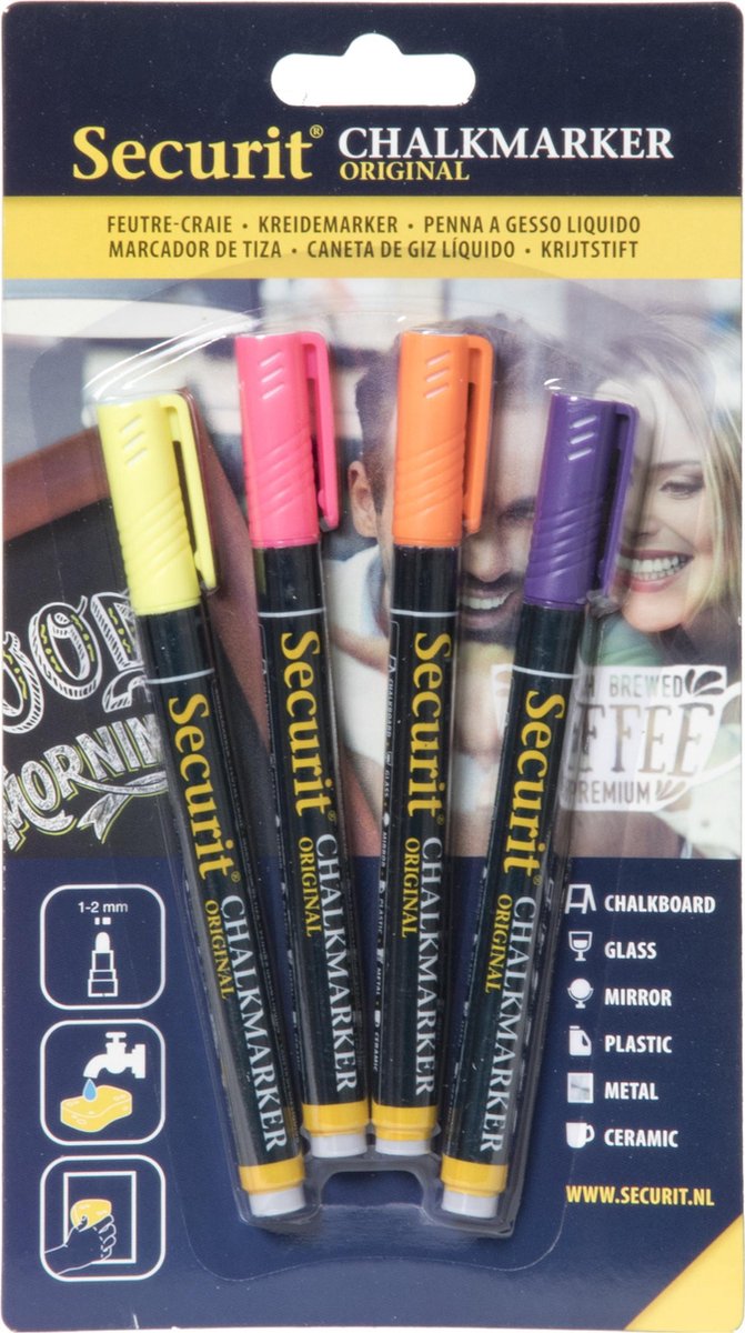 Deze set van dunne krijtstiften in de kleuren geel, oranje, roze en paars van Securit kunt u gebruiken op alle niet-poreuze ondergronden. Deze stiften zijn uitstekend geschikt voor het fijn schrijven op onder andere krijtborden, glas en keramiek. Denkt u bijvoorbeeld aan het schrijven van uw (dag) menu op een leuke en creatieve manier. De krijtstiften zijn gemakkelijk schoon te maken met water en een doekje. Wilt u perfect schoon resultaat? Dan kunt u uw krijtborden ook schoonmaken met de bijbehorende Securit Cleaner. Liquid Chalkmarker “ORIGINAL” – High quality liquid chalkmarker, non-toxic, non-smudging (when dry), resistant to fading, staining and light rain. Easy to use, simply shake, push on the nib, write and allow to dry for a couple of minutes. Then simply wipe clean and write again. Easy to clean with water. Suitable for chalkboards, glass, metal, plastic and any non-porous surfaces.