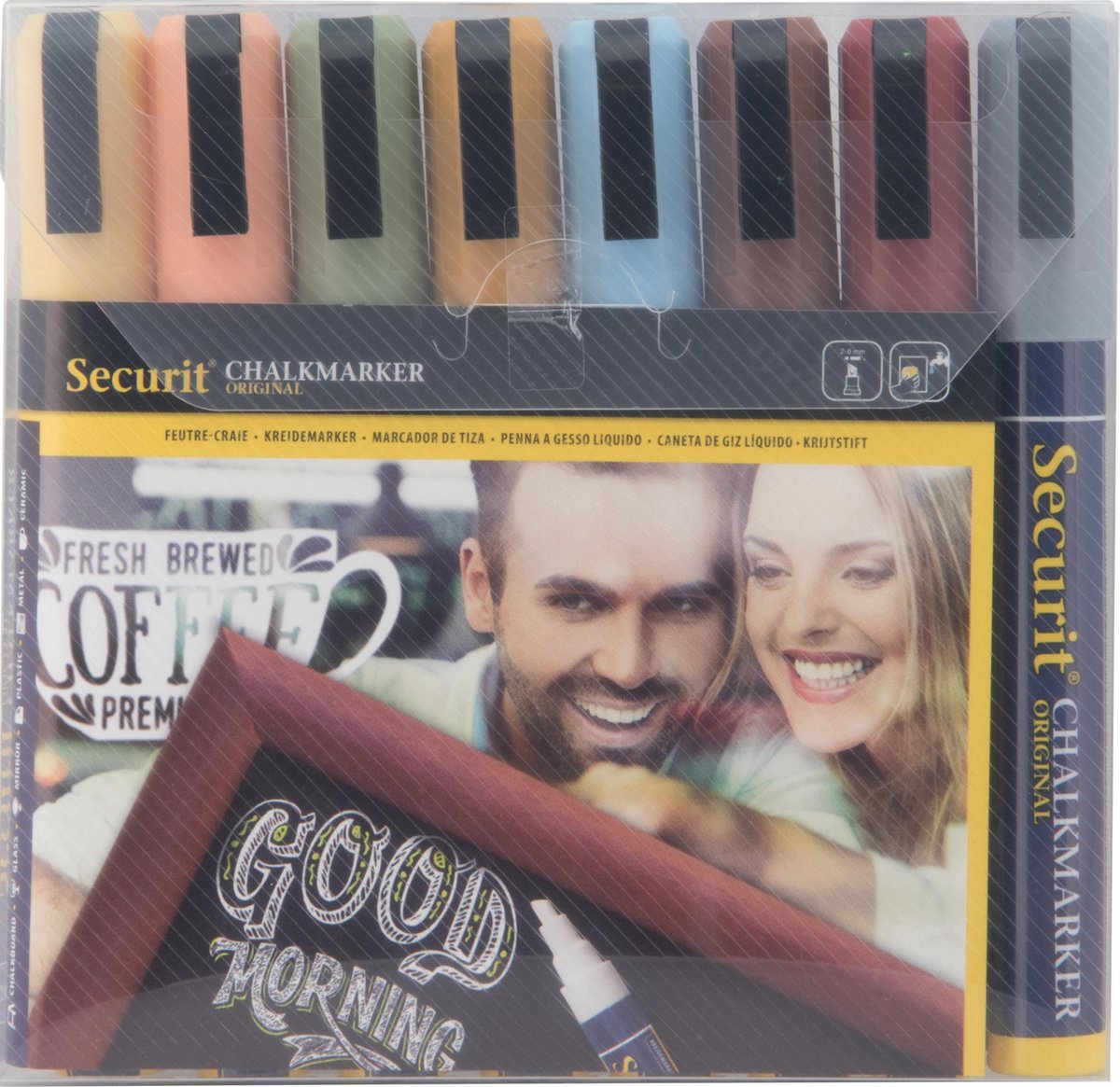Krijtmarker met beitelvormige punt. Geurneutrale vloeibare inkt op waterbasis. Met een vochtige doek te verwijderen van bijna alle gladde oppervlaktes. Ideaal voor gebruik op krijtborden, glas en ramen. Schrijfbreedte 2-6mm.Verpakkingseenheid per set/blister.