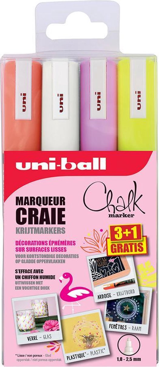 Uni Chalk Markers, zijn verfstiften met (een soort) kalk, die op verschillende ondergronden kunnen worden aangebracht. De Uni Krijtstiften zijn voorzien van een kogel, door te schudden wordt de verf in de verfstift vloeibaar. Als je de punt van de Uni Krijtstift indrukt loopt de verfstift vol en kan je gemakkelijk lijnen trekken. De Uni Krijtstift is perfect om mee op ramen en schoolborden te schrijven of tekenen. Het mooie van de marker is dat hij niet stoft zoals een krijtje dat doet en en goed hecht aan de ondergrond. Anders dan de Acrylstift van Posca is de Uni Krijtstift er makkelijk halen met water en een spons. Een regenbui zal de verf echter niet zomaar van het raam spoelen