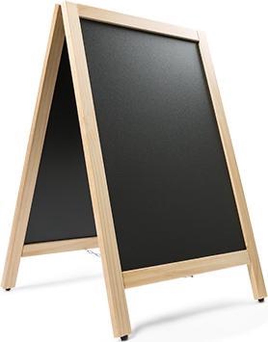 Het meest verkochte krijtstoepbord met 2 jaar garantie! De poten zijn voorzien van rubberen doppen tegen waterschade en overige beschadiging van het hout. Beide kantern van dit krijtbord zijn beschrijfbaar met krijtstiften, ideaal voor snel wisselende reclame uitingen en menu's. Door klein formaat makkelijk verplaatsbaar. Kenmerken: Buitenmaat 55 x 85 cm (bord 47 x 67 cm) Volledig gemonteerd geleverd Voor watervaste en waterbasis krijtstift Makkelijk te reinigen Dennenhout Frame