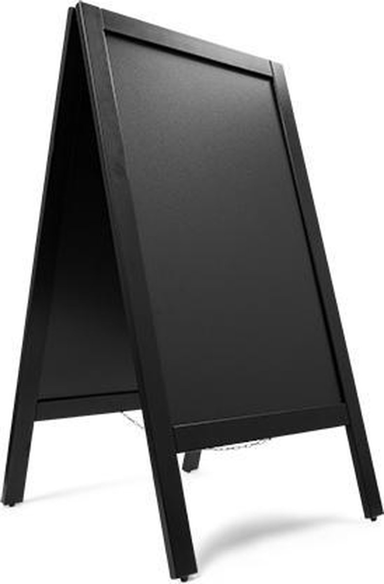 Uniek in Nederland, Nergens anders Verkrijgbaar! Exclusief, zwart krijtstoepbord met 2 jaar garantie, voorzien van rubberen doppen onder de poten tegen waterschade en overige beschadiging van het hout. Beide kanten van dit krijtbord zijn beschrijfbaar met krijtstiften, ideaal voor snel wisselende reclame uitingen en menu's. Kenmerken: Buitenmaat 75 x 135 cm (bord 58,5 x 94 cm) Volledig gemonteerd geleverd Voor watervaste en waterbasis krijtstift (niet geschikt voor gewone krijtjes) Makkelijk te reinigen Houten Frame