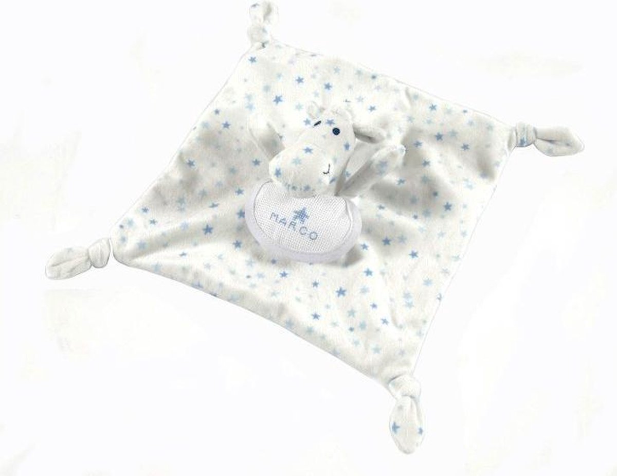 Kroeldoek paard met blauw sterren met slab van dmc gn204 is een heel leuk kraamkado.Op het slabbetje kunt u de naam borduren. Bij deze kroeldoek zit een beschrijving en div patroontjes om een originele kado maken