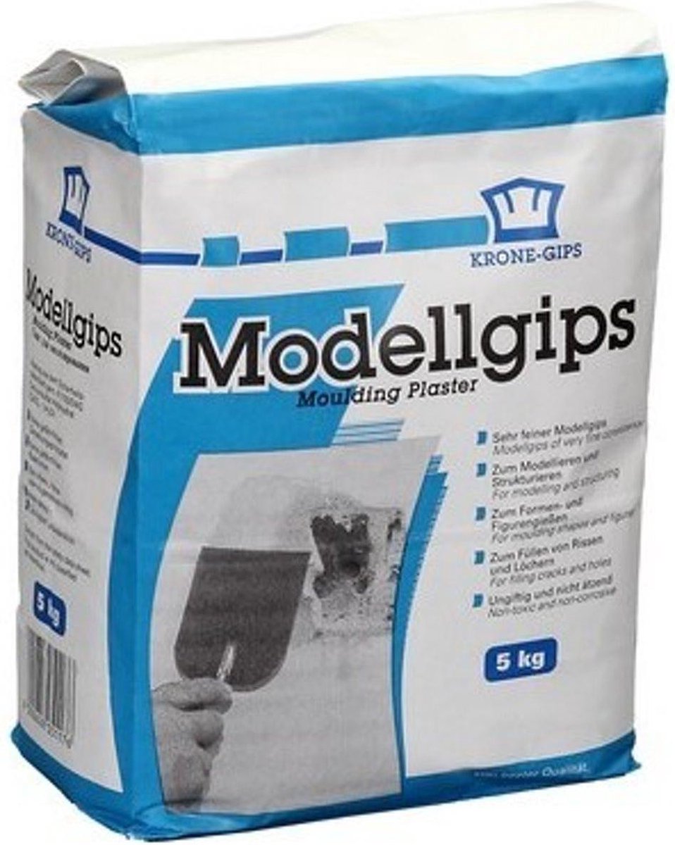 Krone Modellgips [ Gips ] 2 PAK a 5000 GRAM. [ 10KG ] Een uitstekende kwaliteit gips, die niet te langzaam uithardt, waardoor het werkstuk zeer stevig wordt. De juiste mengverhouding met water is afhankelijk van de te maken vorm en kan proefondervindelijk bepaald worden. Mengverhouding: 1,33 kg : 1 liter water.