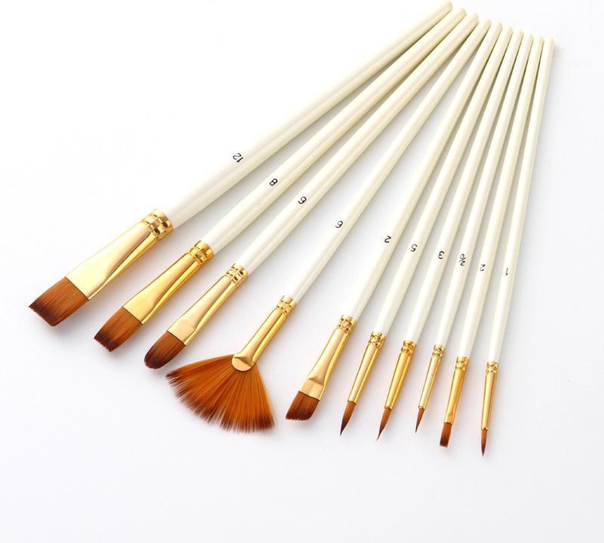 10 verschillende nylon penselen van hout met nylon haren. In deze set tref je platte kwasten, punt penselen en een waaierkwast aan. De kwasten zijn uitstekend geschikt voor waterverf, acrylverf en olieverf. Lengte: 20CM