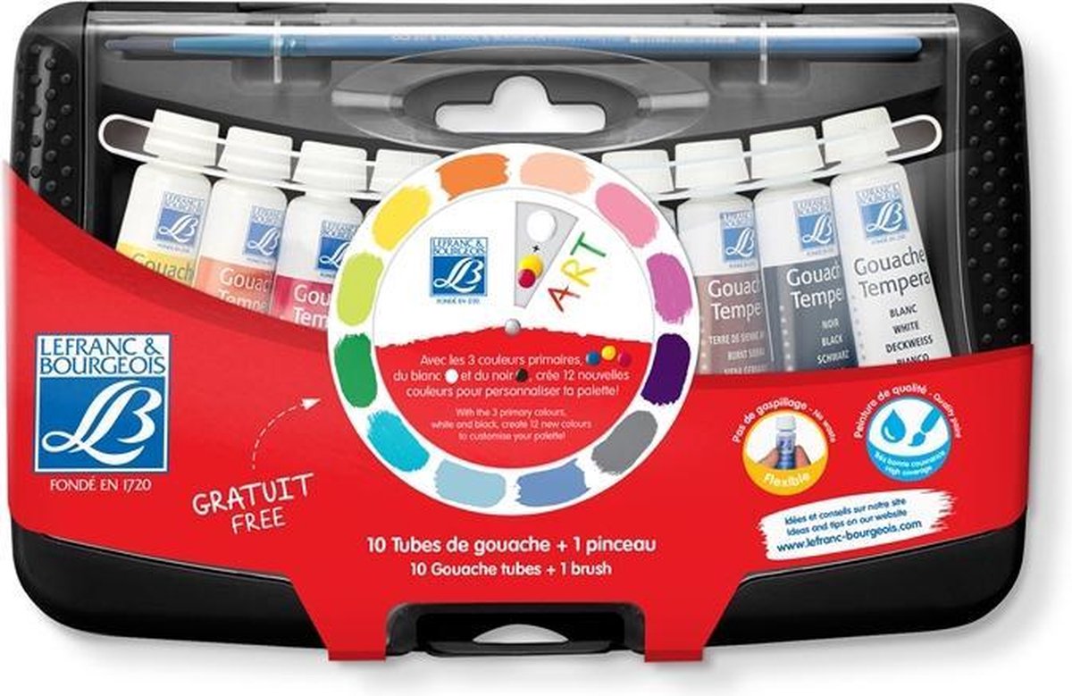Lefranc & Bourgeois plakkaatverf set. Kunststof bewaardoos met 10 tubes (10ml) plakkaatverf. Bij de set zit ook een geschikt penseel, model rond. Inclusief een kleine mengschijf. Door aan de schijf te draaien kun je gemakkelijk zien welke kleur je moet mengen.