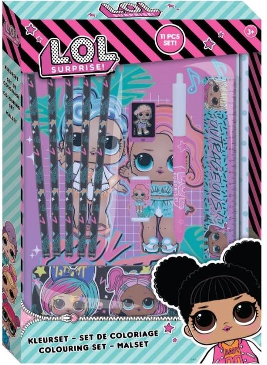 L.O.L. Surprise! kleurset Beleef urenlang speelplezier met deze kleurset van L.O.L. Surprise! De set bevat allerlei potloden en pennen zodat jij alle kleurplaten helemaal kan invullen! Specificaties: Kleur: multicolor Geslacht: junior Materiaal: papier, kunststof, staal Afmetingen: 22,5 x 32 x 3,5 cm (L x B x D) Afmetingen pennendoos: 20,5 x 6 x 2 cm (L x B x D) Afmetingen notitieboek: 18 x 25 cm (L x B) Leeftijd: vanaf 3 jaar Inhoud: 1 Pennendoos 1 Liniaal 1 Balpen 1 Gum 1 Puntenslijper 1 Notitieboek 5 Kleurpotloden