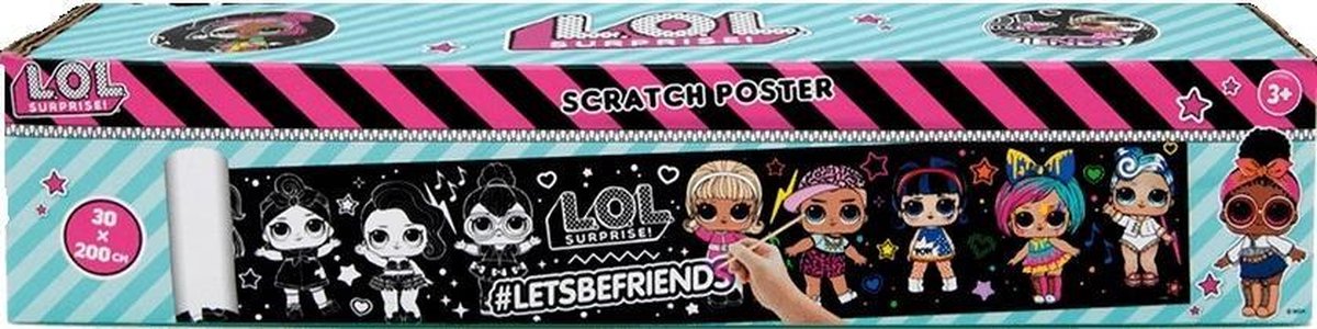 L.O.L. Surprise! krasposter Teken de mooiste creaties op deze grote krasposter. De mooiste kleuren komen tevoorschijn dankzij de kraspen! Deze lange poster zorgt voor urenlang tekenplezier. Heel leuk om cadeau te geven aan de echte creatievelingen! Specificaties: Kleur: zwart Geslacht: junior Materiaal: karton Afmetingen: 30 x 200 cm (B x L) Leeftijd: vanaf 4 jaar Inhoud: 1 Poster 1 Kraspen