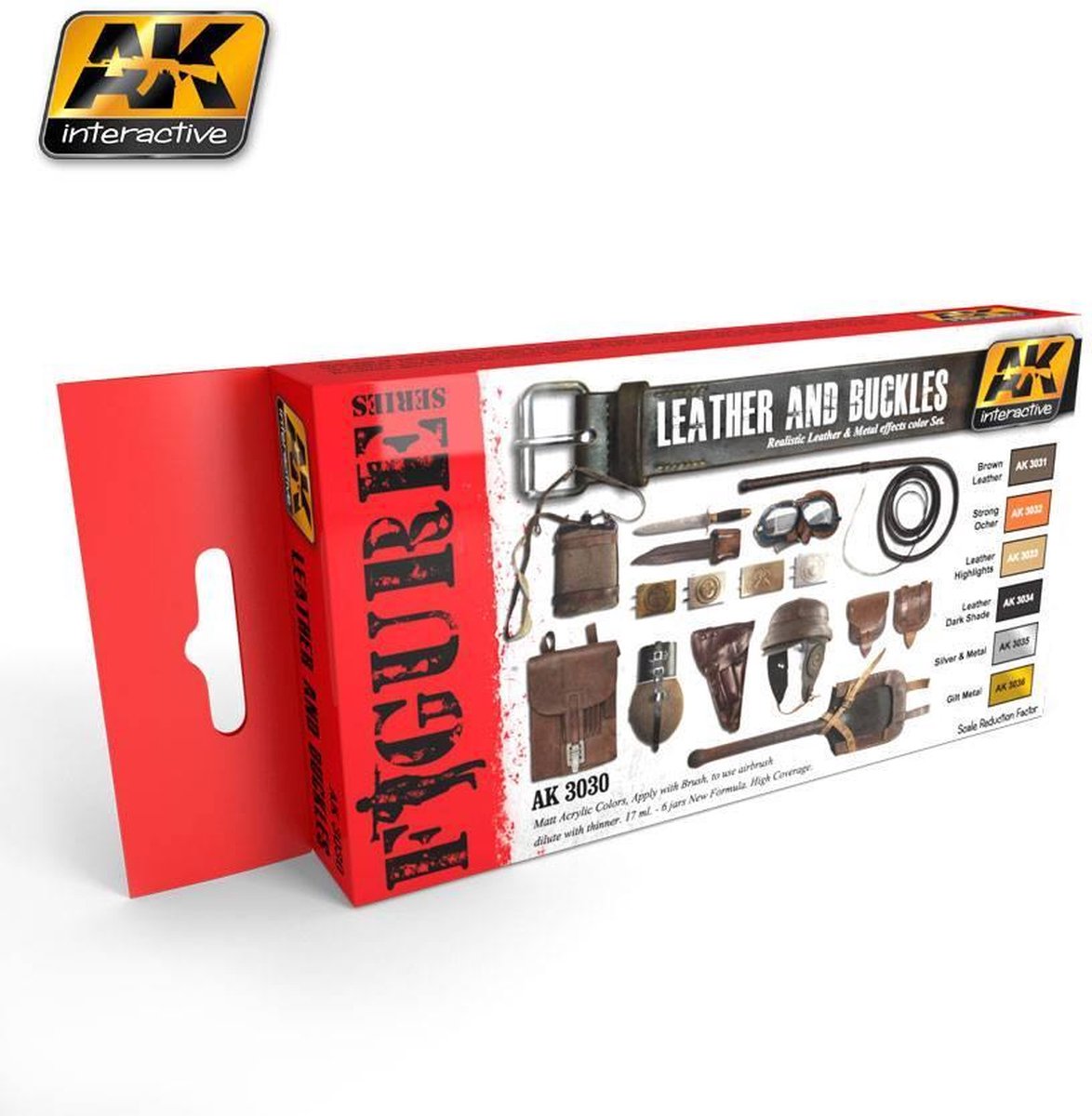 AK interactive Figure Series Leather and Buckles (AK3030). Deze collectie kleuren behoort tot de Figure Series lijn. Speciaal geformuleerd door de productontwikkelaars om accessoires zoals leer, gespen, knopen, laarzen, enz. op miniatuurfiguren te schilderen. De verf is super mat en van extreem hoge kwaliteit. De dekkings- en droogkwaliteit is ontwikkeld om iedere accesoire tot in perfectie te kunnen schilderen. Kan worden aangebracht met penseel of airbrush, verdund met verdunners specifiek voor acrylverf. Deze set bevat: AK3031 Brown Leather, AK3032 Strong Ocher, AK3033 Leather Highlights, AK3034 Leather Dark Shade, AK3035 Siver & Metal, AK3036 Gilt Metal
