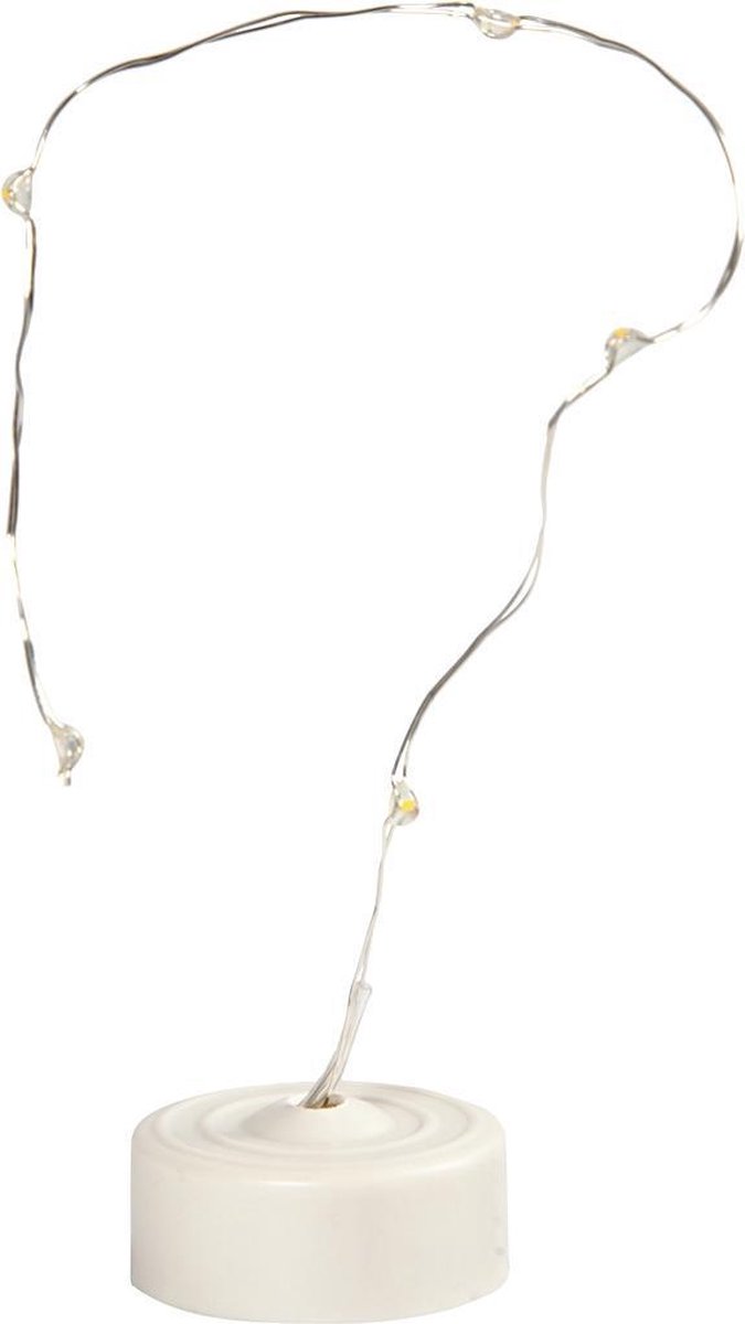 Lichtslinger op batterijen bestaande uit 6 kleine LED lampjes op een dun verzilverd koperdraad gemonteerd aan een ronde doos voor batterijen in de grote van een waxinelichtje. Werkt op 1 celbatterij, artikelnr. 52330 (niet inclusief).Lichtslinger op batterijen bestaande uit 6 kleine LED lampjes op een dun verzilverd koperdraad gemonteerd aan een ronde doos voor batterijen in de grote van een waxinelichtje. Werkt op 1 celbatterij, artikelnr. 52330 (niet inclusief).