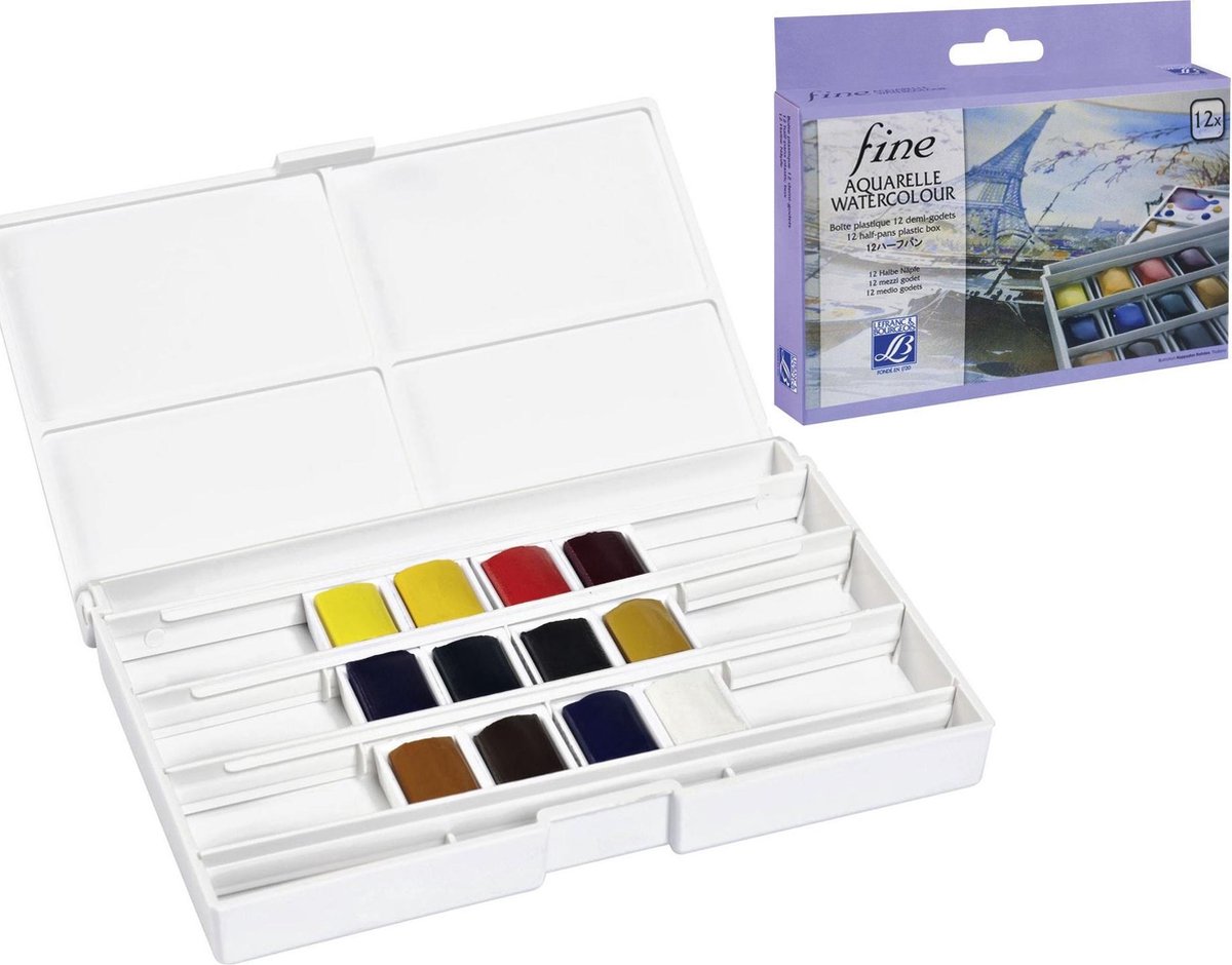 Kunststof palet doosje gevuld met 12 halve napjes fijne aquarelverf, het doosje bied nog ruimte aan 12 halve napjes of 6 hele napjes