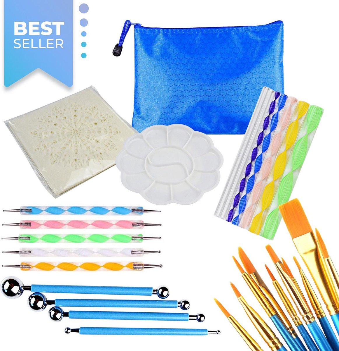 Je bent begonnen met mandala dotting of misschien wil je er mee starten... Met de mandala tools set neem je in ieder geval een vliegende start en heb je meteen alles bij de hand. Zo kan je overzichtelijk werken, maak je de mooiste stippen en de leukste kunstwerkjes. De complete mandala toolset De set bestaat uit maar liefst 44 tools en een handige opberg etui waarin je na het “dotten” alles netjes kan opbergen. Met al deze tools in je bezit, heb je eindeloze mogelijkheden binnen handbereik en kan je de creativiteit de vrije loop laten gaan. Less is vaak more maar dat geldt niet voor deze set! De mooiste stippen Al de tools zijn vervaardigd van hoogwaardig materiaal en zijn daardoor uitermate geschikt om de mooiste stippen te maken op papier, nagels of steen. Het is dus absoluut niet nodig om veel verf te gebruiken om het gewenste resultaat te bekomen. Makkelijk en snel proper te maken Na het gebruik maak je alle tools makkelijk proper met keukenrol of met een vochtige doek. Als