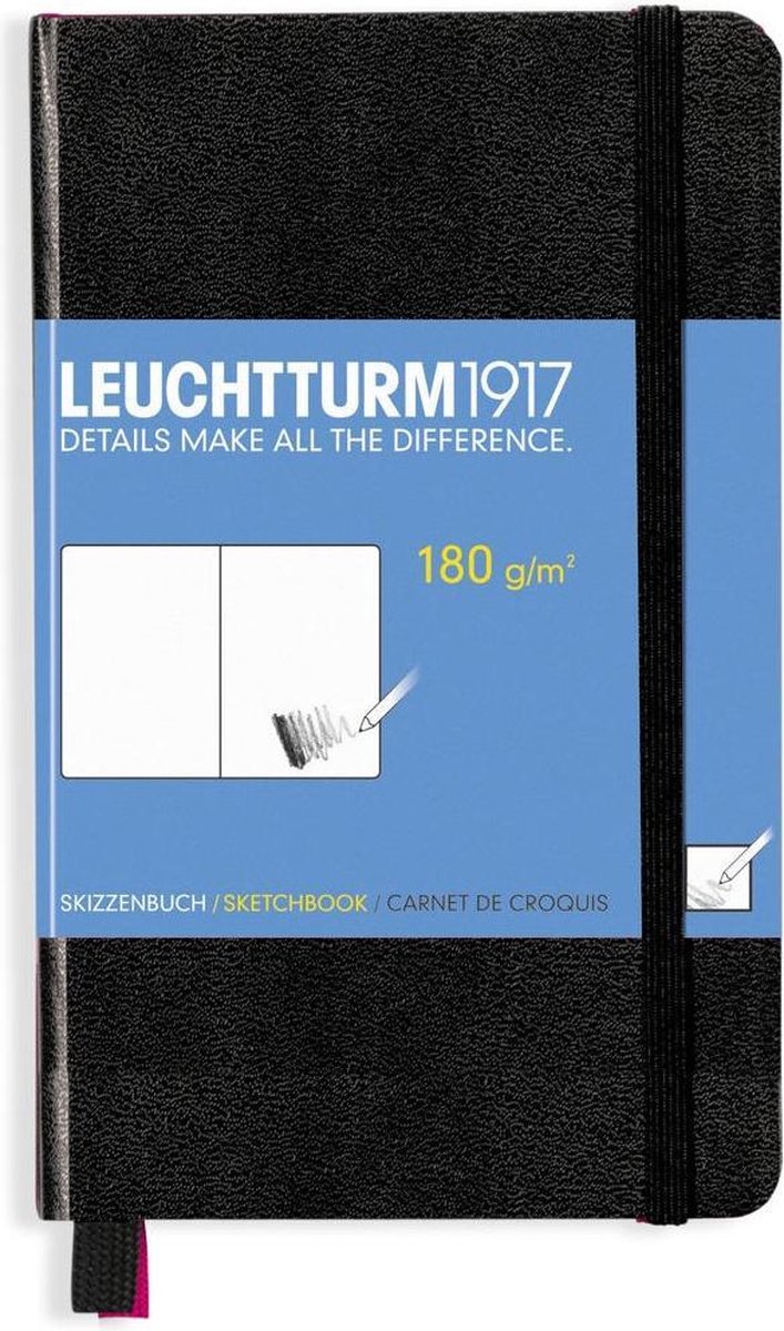 LEUCHTTURM1917 Pocket Sketchbook De schetsboeken van Leuchtturm bevatten 96 pagina's wit, 180 grams papier. Het papier is uitermate geschikt voor het gebruik van potloden, houtskool, krijt, stiften en markers. De schetsboeken zijn stevig vanwege de ingebonden rug en harde kaft. Het formaat is 90 x 150 mm.
