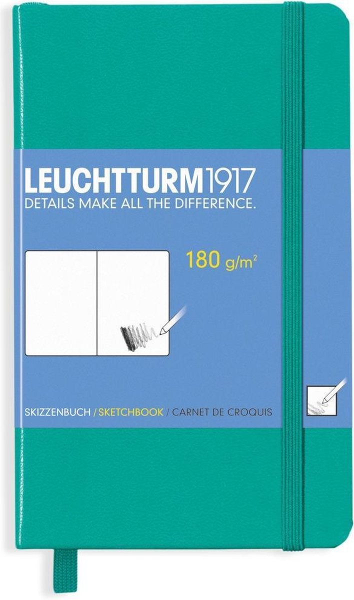 LEUCHTTURM1917 Pocket Sketchbook Emerald De schetsboeken van Leuchtturm bevatten 96 pagina's wit, 180 grams papier. Het papier is uitermate geschikt voor het gebruik van potloden, houtskool, krijt, stiften en markers. De schetsboeken zijn stevig vanwege de ingebonden rug en harde kaft. Het formaat is 90 x 150 mm.
