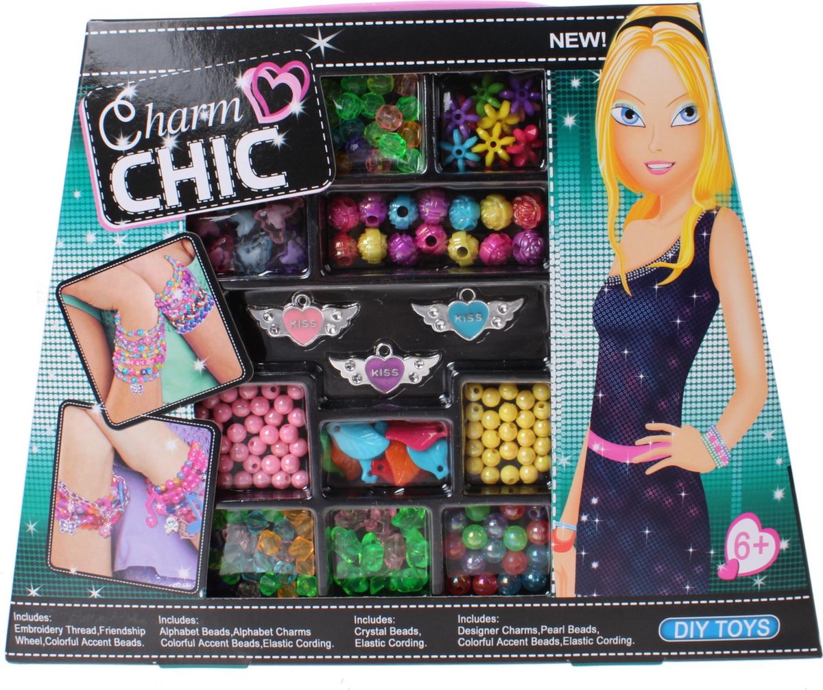 LG-Imports charm chic armbandjes maken In deze set vind je de mooiste kralen om prachtige armbandjes mee te maken. Ga jij voor een armband met je eigen naam of met vrolijke kleuren? Er zijn zoveel mogelijkheden, dus laat je creativiteit maar los! Specificaties: Geslacht: meisjes Kleur: groen Materiaal: kunststof Leeftijd: vanaf 6 jaar Inhoud: Rijgkoord Verschillende soorten kralen