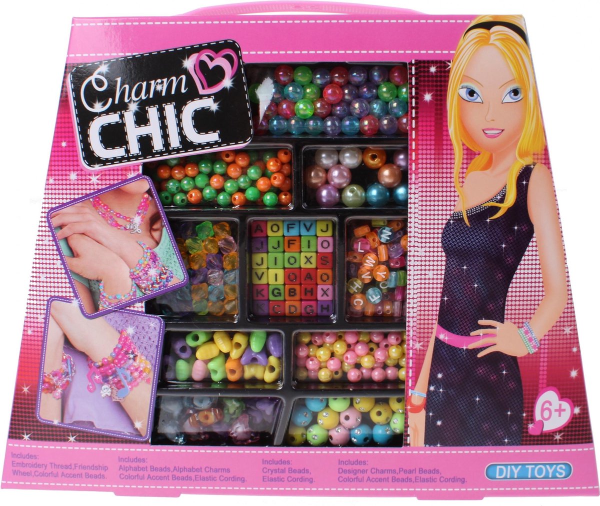 LG-Imports charm chic armbandjes maken In deze set vind je de mooiste kralen om prachtige armbandjes mee te maken. Ga jij voor een armband met je eigen naam of met vrolijke kleuren? Er zijn zoveel mogelijkheden, dus laat je creativiteit maar los! Specificaties: Geslacht: meisjes Kleur: roze Materiaal: kunststof Leeftijd: vanaf 6 jaar Inhoud: Rijgkoord Verschillende soorten kralen