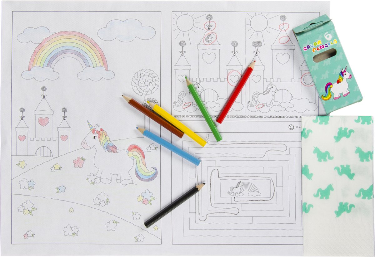 LG-Imports horecabox unicorn Laat jou creativiteit de vrije loop en kleur met deze leuke unicorn kleurset jouw eigen placemats in en laat iedereen jouw creatie zien! Specificaties: Kleur: wit Geslacht: junior Materiaal: karton, hout Afmetingen placemat: 22 x 20 cm (L x B) Afmetingen verpakking: 40 x 30 cm (L x B) Leeftijd: vanaf 4 jaar Inhoud: 100 Placemats 100 Sets kleurpotloden 100 Servetjes