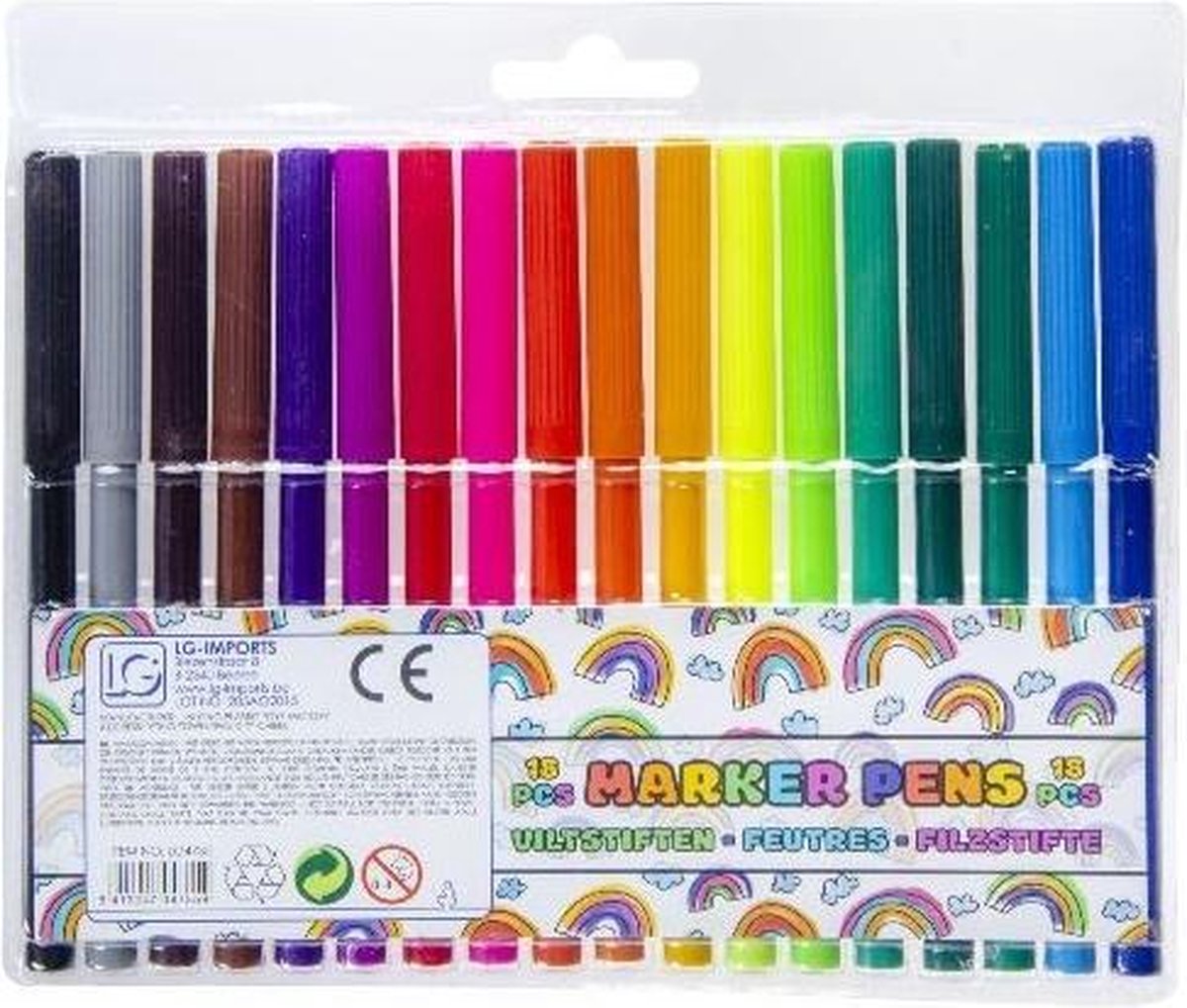 LG-Imports viltstiften gekleurd Maak de mooiste tekeningen met deze viltstiften. In de set zitten 18 verschillende kleuren. Niks houdt jou nu nog tegen om de mooiste tekeningen te maken. Specificaties: Kleur: multicolor Geslacht: junior Materiaal: kunststof Leeftijd: vanaf 3 jaar Inhoud: 18 Viltstiften