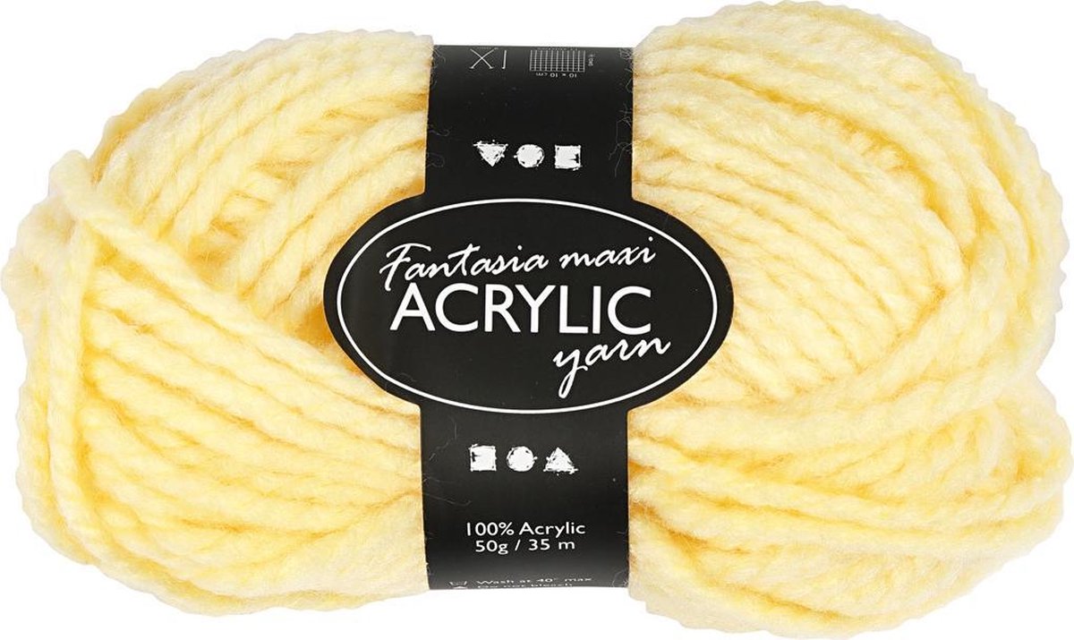Lichtgeel maxi acryl garen 35 meter. Bolletje lichtgele maxi acryl garen met een lengte van ongeveer 35 meter. Hoge kwaliteit garen, 2-draads van 100% acryl, 50 grams. 22 sts x 26 rows is 10 x 10 cm met naald no. 9. Wasbaar op 40 graden.