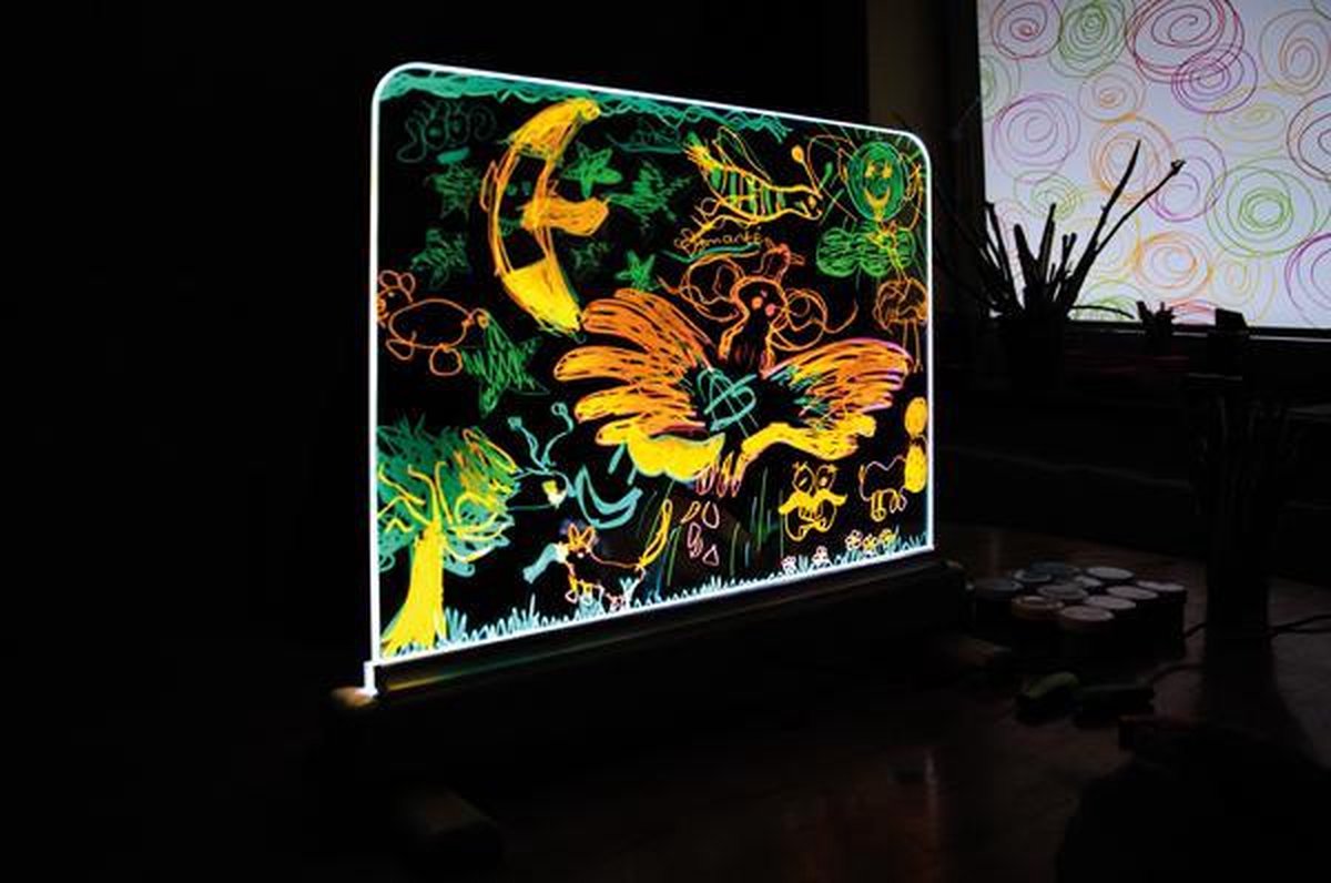 Lichtgevende ezel. Spelen, schilderen, therapie. De hoogwaardige lichtgevende ezel van speciaal glas is een fascineren medium om te schilderen met vingerverf, gouache, aquarelverf en lichtgevende potloden. Het kan aan twee kanten door twee kinderen worden geverfd en nodigt dus uit tot experimenteren. Naast wit licht zijn 15 extra kleuren en 4 kleurwisselmodi mogelijk. Afmeting: 55,7 x 46,7 x 4,5 cm.