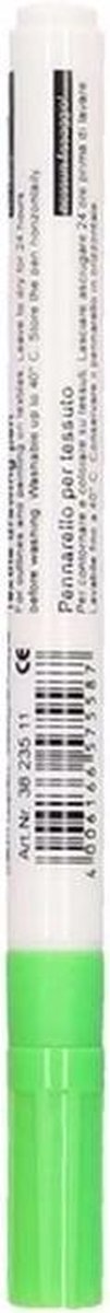 Lichtgroene textielstift met fijne punt. Stift met een fijne punt om op kleding (textiel) te schrijven zonder te fixeren! Schrijven, laten drogen en klaar om te dragen. De stift is watervast dus het textiel kan in de wasmachine.
