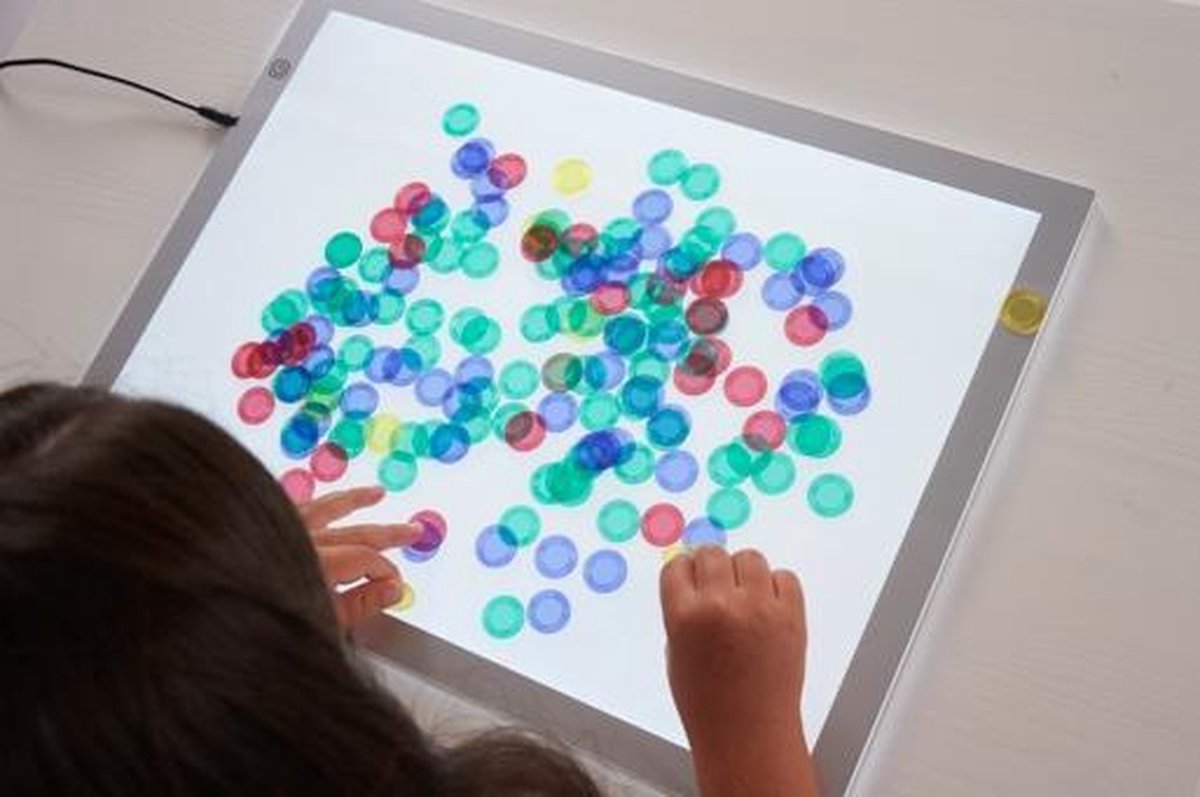 Deze lichttafel is ideaal voor ieder wie met z'n kinderen spelenderwijs aan de slag wil gaan. Van prenten overtekenen, de schrijfmotoriek oefenen, spelen met verf, rijst, scheerschuim, zand, ... De oppervlakte van het verlichte deel is kleiner dan de totaalafmeting, namelijk 28.5 cm x 41 cm. De lichttafel werkt op netspanning en andere toebehoren. Zonder extra toebehoren zoals fiches en dergelijke.