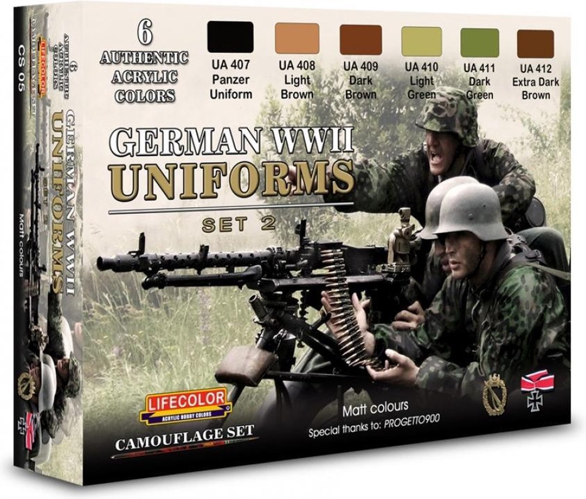 Set van 6 acrylkleuren voor Duitse WWII Uniformen Set2 + 6 pipetjes 2ml De kleuren hebben een speciaal mat uiterlijk om het stofeffect te benaderen. De set is goed bruikbaar voor de speciale aanvalskleding. LifeColor laat zich prima verwerken met zowel penseel en kwast als met een airbrush. Bij airbrush gebruik moet er wel verdund worden, dit kan met water maar het beste resultaat bereik je met LifeColor thinner. LifeColor raadt aan om met een lage druk te werken.