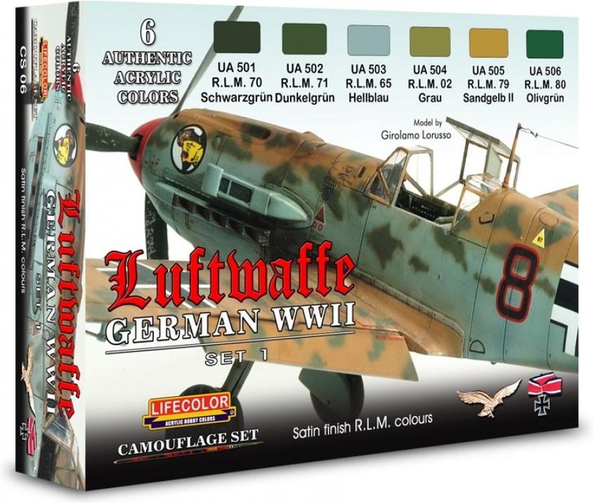 Set van 6 acryl kleuren voor Duitse WWII vliegtuigen Set1 + 6 pipetjes 2ml De perfecte reproductie van de originele RLM stalen met een mat of licht zijdemat eindresultaat. Heel geschikt voor het reproduceren van het tri-toon camouflage uiterlijk op Duitse WWII vliegtuigen gebruikt in Europa en Afrika. LifeColor laat zich prima verwerken met zowel penseel en kwast als met een airbrush. Bij airbrush gebruik moet er wel verdund worden, dit kan met water maar het beste resultaat bereik je met LifeColor thinner. LifeColor raadt aan om met een lage druk te werken.