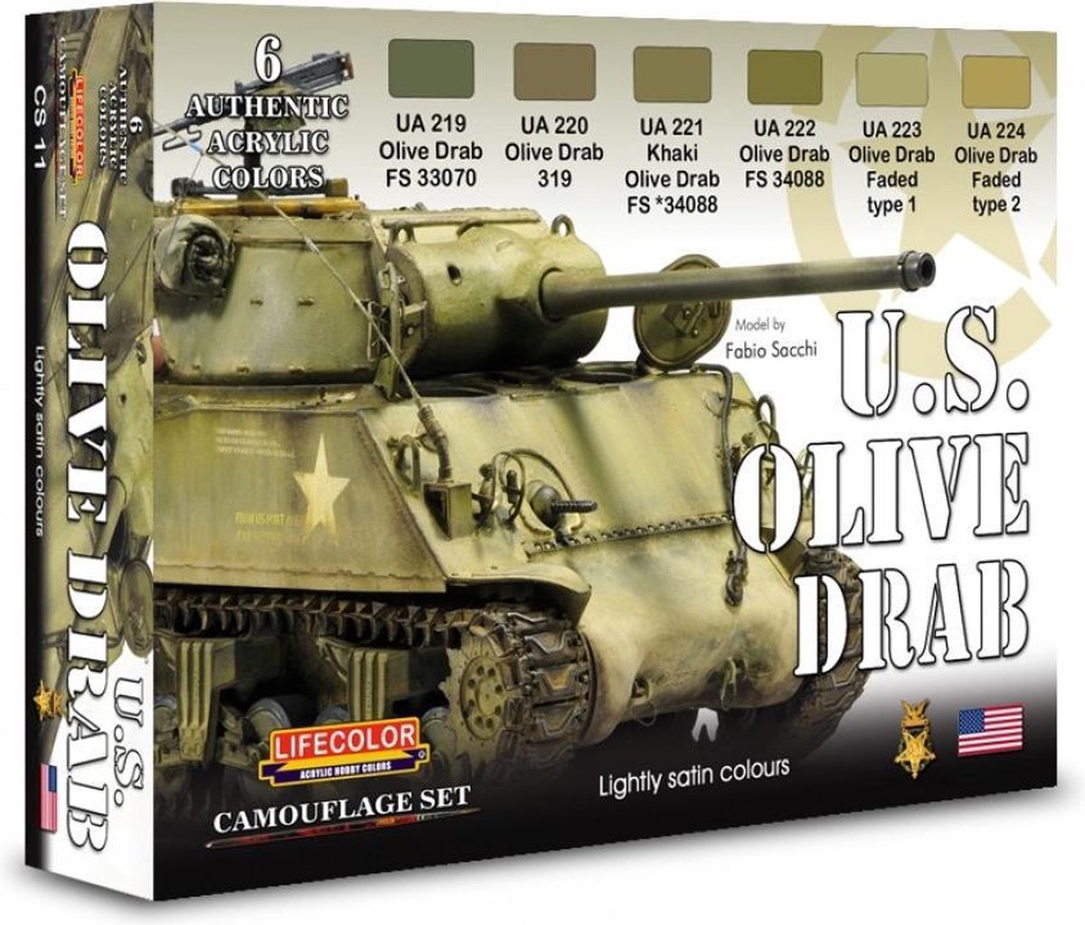 Lifecolor CS11 U.S. Olive Drab + 6 pipetjes 2ml Olive drab was de overheersende kleur op alle Amerikaanse voertuigen tijdens de Tweede Wereldoorlog. De set bevat o.a.: twee verouderde kleuren en drie gradaties van olijfgroen zoals gebruikt tijdens de oorlogsperiode en daarna tot 1950. LifeColor laat zich prima verwerken met zowel penseel en kwast als met een airbrush. Bij airbrush gebruik moet er wel verdund worden, dit kan met water maar het beste resultaat bereik je met LifeColor thinner. LifeColor raadt aan om met een lage druk te werken.