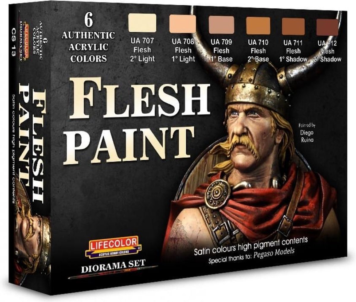 Set met 6 kleuren om huidtinten te creëren + 6 pipetjes 2ml Speciale kleuren met hoge pigmentatie, niet helemaal mat, om huidtint te kunnen benaderen. Met de zes kleuren is het mogelijk om verschillende schaduwtonen te creëren en zo een overtuigend licht en donker effect te bereiken. LifeColor laat zich prima verwerken met zowel penseel en kwast als met een airbrush. Bij airbrush gebruik moet er wel verdund worden, dit kan met water maar het beste resultaat bereik je met LifeColor thinner. LifeColor raadt aan om met een lage druk te werken.