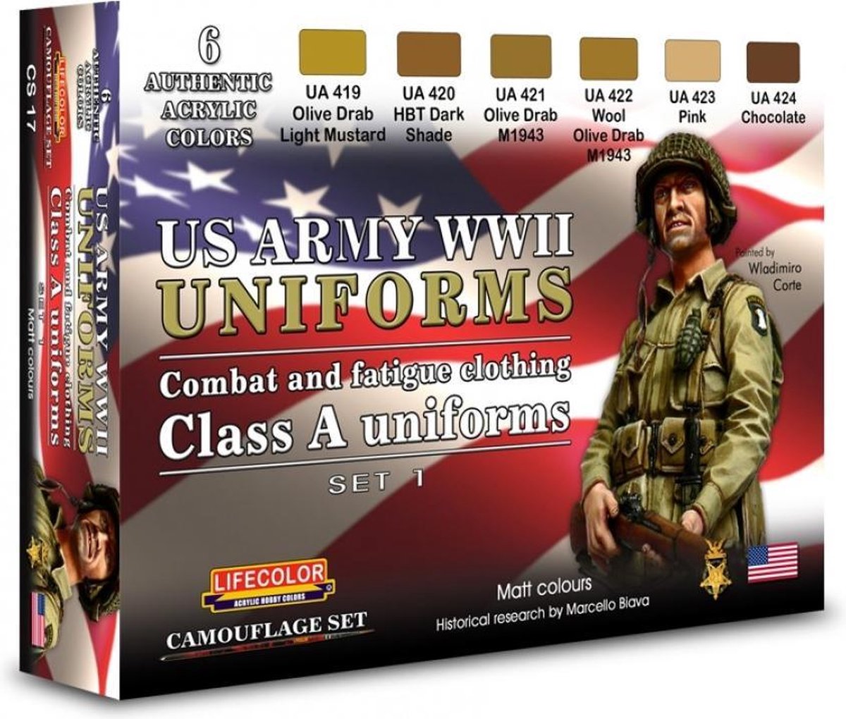 Set van 6 acrylkleuren voor US Army WWII uniformen + 6 pipetjes 2ml Set 1 Speciaal matte kleuren voor alle US Army aanvalskleding en Class-A uniformtinten. LifeColor laat zich prima verwerken met zowel penseel en kwast als met een airbrush. Bij airbrush gebruik moet er wel verdund worden, dit kan met water maar het beste resultaat bereik je met LifeColor thinner. LifeColor raadt aan om met een lage druk te werken.