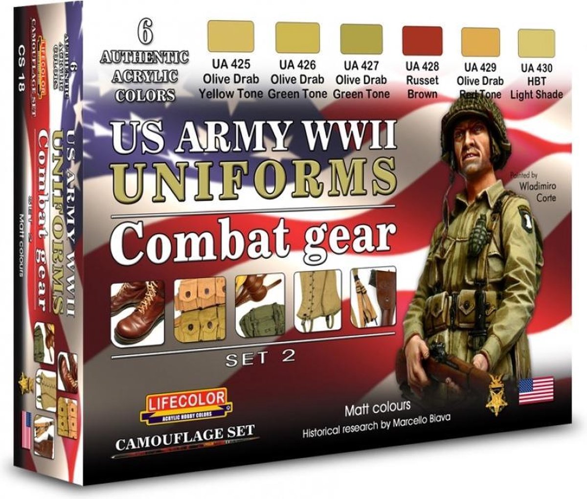 Set van 6 acrylkleuren voor WWII US Army uniformen + 6 pipetjes 2ml Set 2 De kleuren hebben een speciaal mat uiterlijk om het stofeffect te benaderen. Ook bij deze set inbegrepen de typische roodbruine leerkleur van het Amerikaanse leger. LifeColor laat zich prima verwerken met zowel penseel en kwast als met een airbrush. Bij airbrush gebruik moet er wel verdunt worden, dit kan met water maar het beste resultaat bereik je met LifeColor thinner. LifeColor raad aan om met een lage druk te werken.