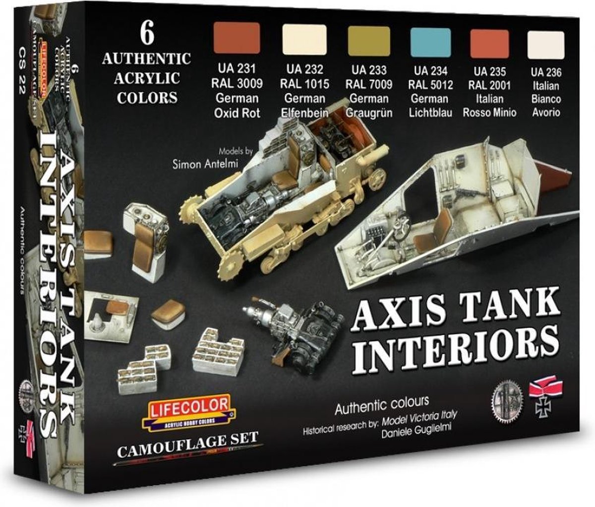 Set van 6 acrylkleuren voor tank interieurs van de AS mogendheden Benaderingen van de originele RAL kleuren voor Duitse en Italiaanse tank interieurs. LifeColor laat zich prima verwerken met zowel penseel en kwast als met een airbrush. Bij airbrush gebruik moet er wel verdund worden, dit kan met water maar het beste resultaat bereik je met LifeColor thinner. LifeColor raadt aan om met een lage druk te werken.