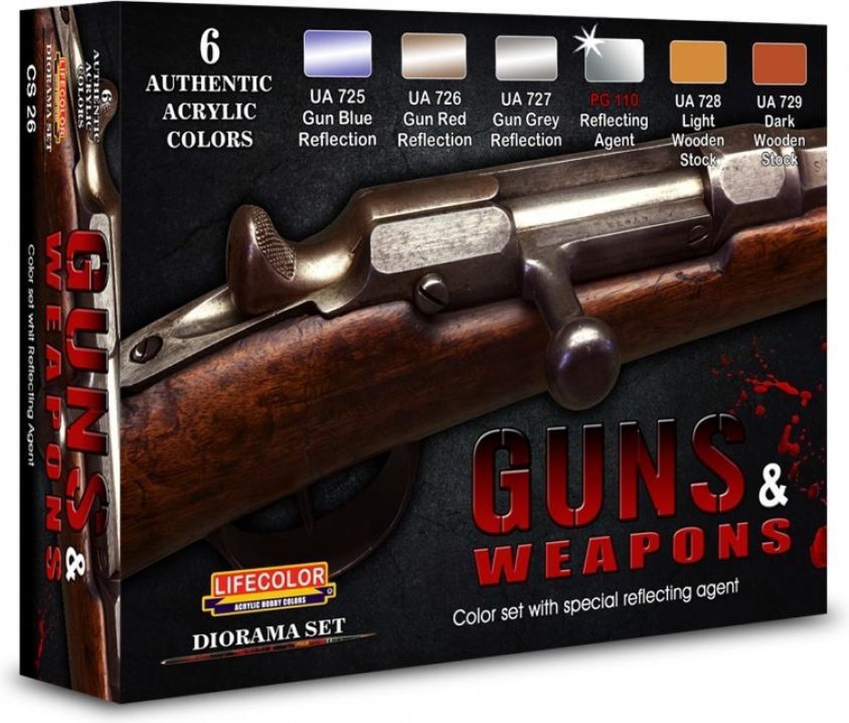 Set van 5 acrylkleuren en Reflecting Agent om wapens mee te beschilderen + 6 pipetjes 2ml Kleurenset om lichte wapens en metaalkleurige onderdelen te verven. Bevat 2 houttinten, 3 basiskleuren voor metalen oppervlakken en een speciale fles "Reflecting Agent". Meng een palet met de door u geselecteerde basiskleur en een klein percentage "Reflecting Agent" en breng het mengsel aan met een penseel of met een airbrush. Eenmaal droog (15-20 min.), polijst met een harde borstel. Door verschillende percentages in kleur met "Reflecting Agent" te mengen en deze min of meer te polijsten, verkrijgt u veel kleuren met metallic tinten. De mengkleur spuiten - Reflecting Agent met airbrush gebruik een 0,3 mm spuitmond en breng bij voorkeur meerdere lagen nat in nat aan. LifeColor laat zich prima verwerken met zowel penseel en kwast als met een airbrush. Bij airbrush gebruik moet er wel verdund worden, dit kan met water maar het beste resultaat bereik je met LifeColor thinner. LifeColor raadt aan om