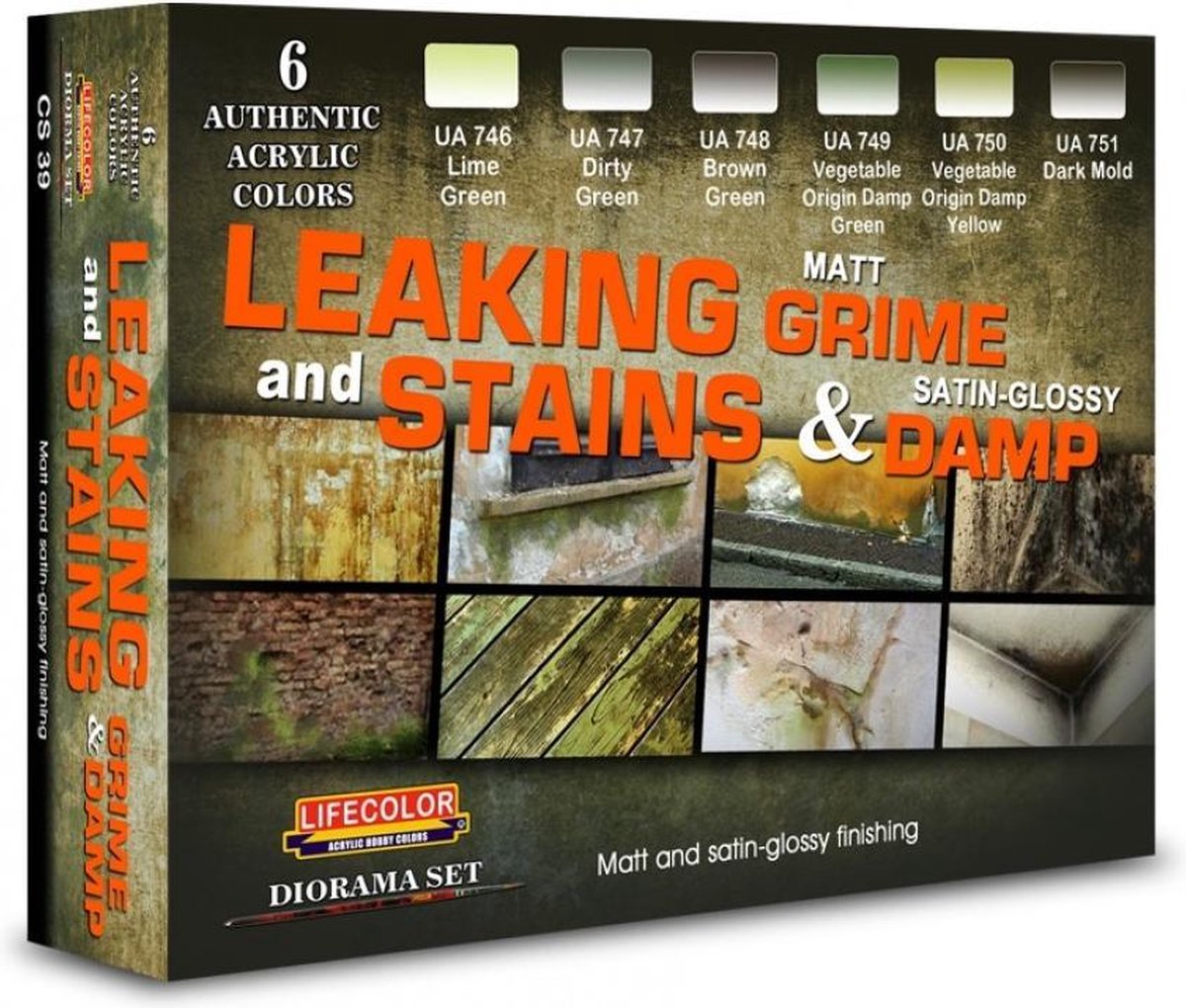 Set van 6 acrylkleuren om lekken, vlekken , vuil en vuilstrepen mee te realiseren + 6 pipetjes ml Set van 3 matte kleuren om vuil en vuilstrepen mee te realiseren en 3 zijdematte kleuren om lekken en vlekken te realiseren. LifeColor laat zich prima verwerken met zowel penseel en kwast als met een airbrush. Bij airbrush gebruik moet er wel verdund worden, dit kan met water maar het beste resultaat bereik je met LifeColor thinner. LifeColor raadt aan om met een lage druk te werken.