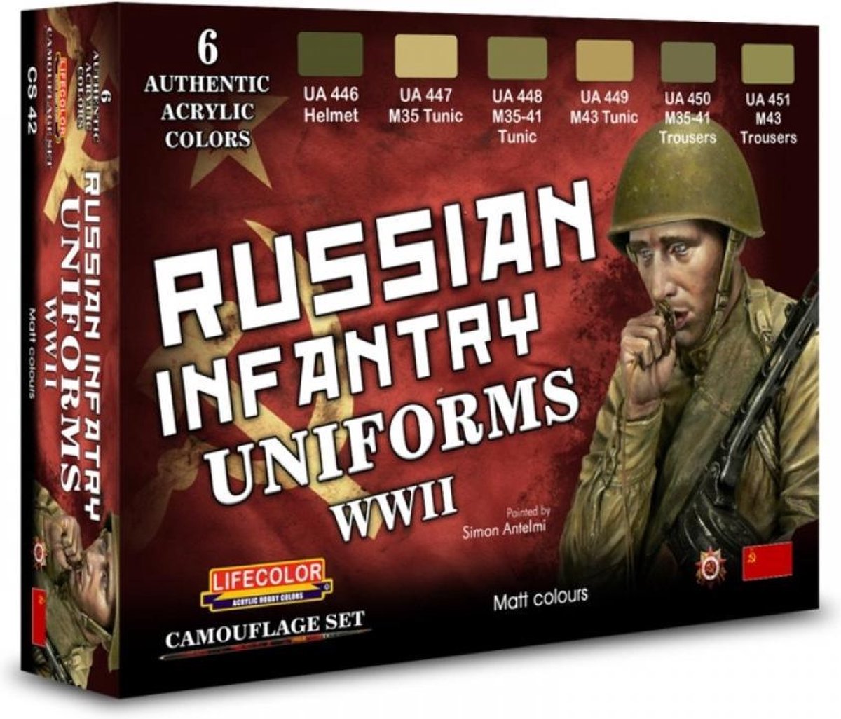 Set van 6 acrylkleuren voor Russische WWII infanterie uniformen + 6 pipetjes 2ml Matte acrylkleuren set om Russische WWII infanterie uniformen te beschilderen. LifeColor laat zich prima verwerken met zowel penseel en kwast als met een airbrush. Bij airbrush gebruik moet er wel verdund worden, dit kan met water maar het beste resultaat bereik je met LifeColor thinner. LifeColor raadt aan om met een lage druk te werken.