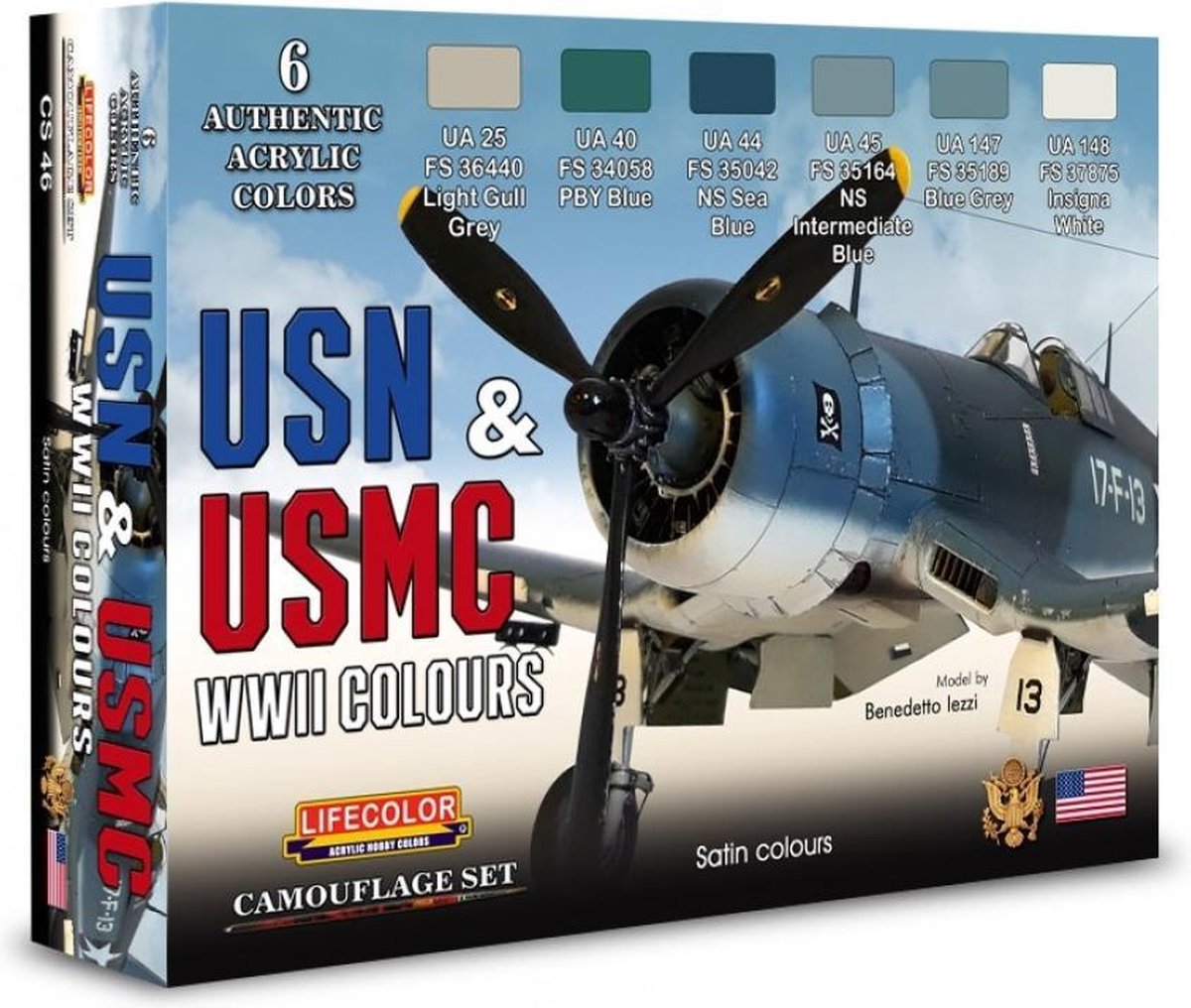 Set van 6 acryl kleuren + 6 pipetjes 2ml Gebruikt op WWII US Navy en US Marine Corps vliegtuigen. LifeColor laat zich prima verwerken met zowel penseel en kwast als met een airbrush. Bij airbrush gebruik moet er wel verdund worden, dit kan met water maar het beste resultaat bereik je met LifeColor thinner. LifeColor raadt aan om met een lage druk te werken.