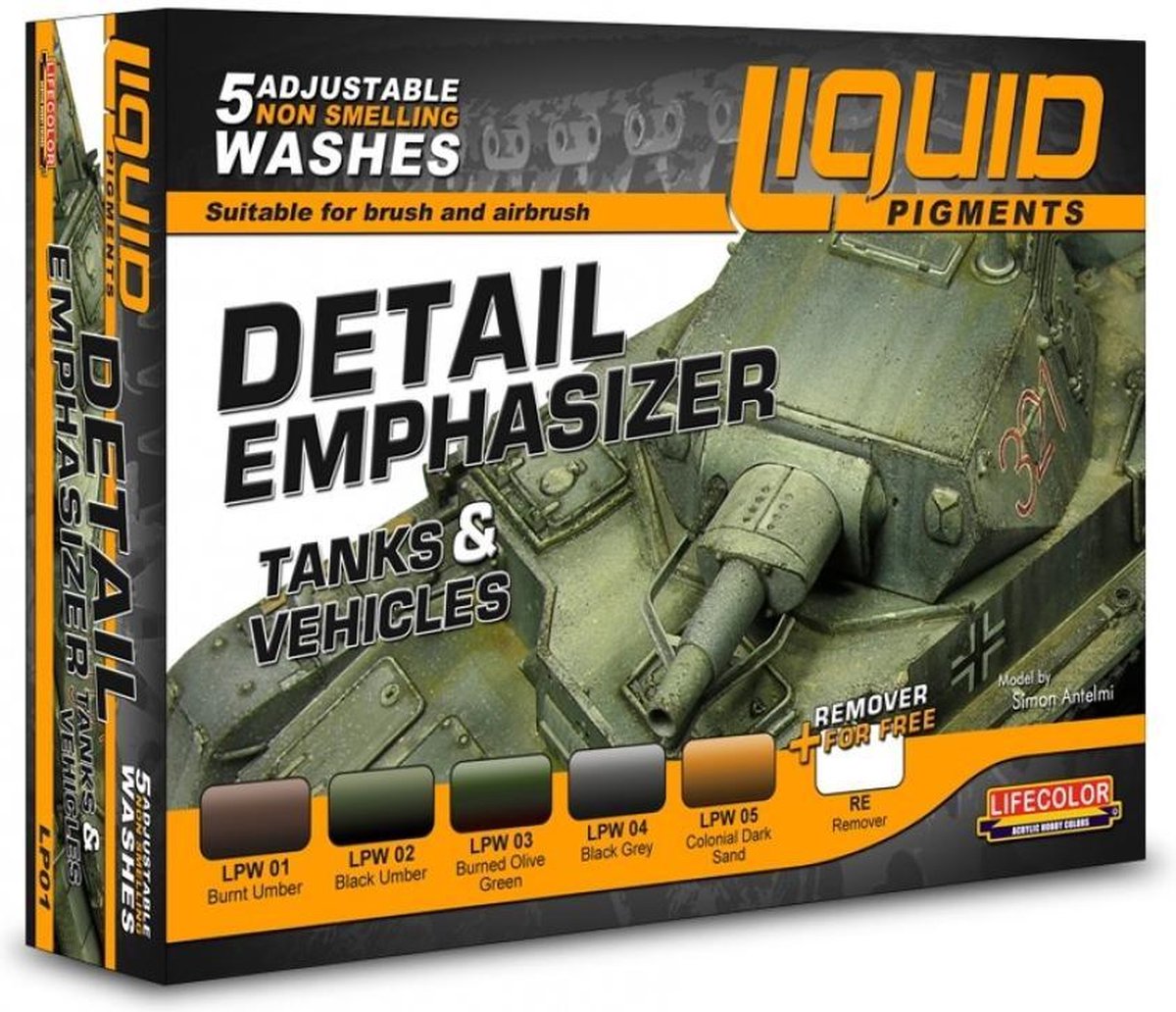 Set met 5 Liquid Pigment Washes + Remover Al onze LifeColor sets worden geleverd inclusief 6 pipetjes van 2ml. Set met 5 flacons vloeibare pigmenten en een flacon remover, voor het benadrukken van bouten, panelen, roosters en andere details. Voor elk type camouflage, licht, donker of meer tinten.