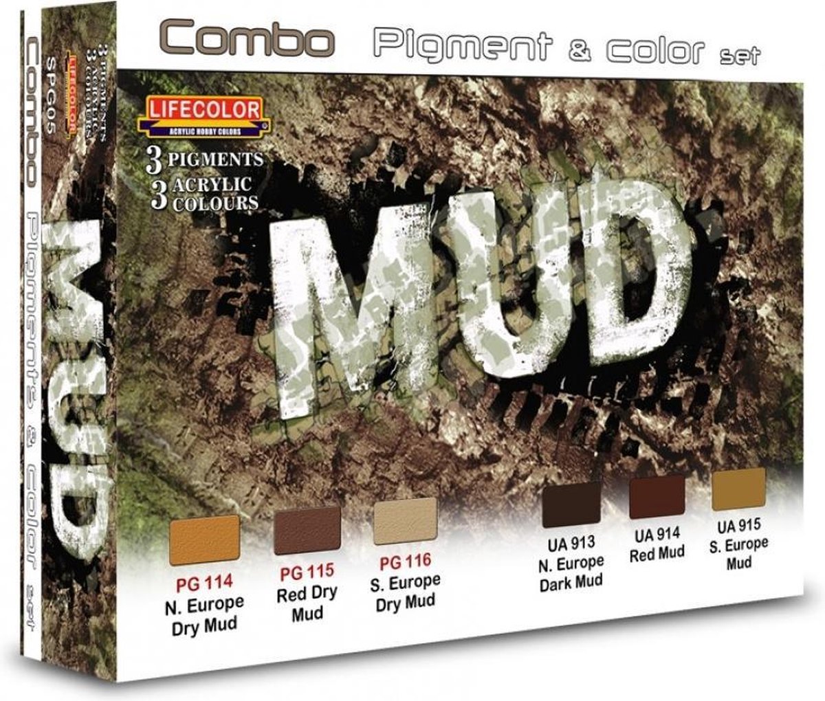 Set van 3 acrylkleuren en 3 pigmenten om modder te simuleren + 6 pipetjes 2ml Om realistische moddereffecten te realiseren op je modellen. LifeColor laat zich prima verwerken met zowel penseel en kwast als met een airbrush. Bij airbrush gebruik moet er wel verdund worden, dit kan met water maar het beste resultaat bereik je met LifeColor thinner. LifeColor raadt aan om met een lage druk te werken.