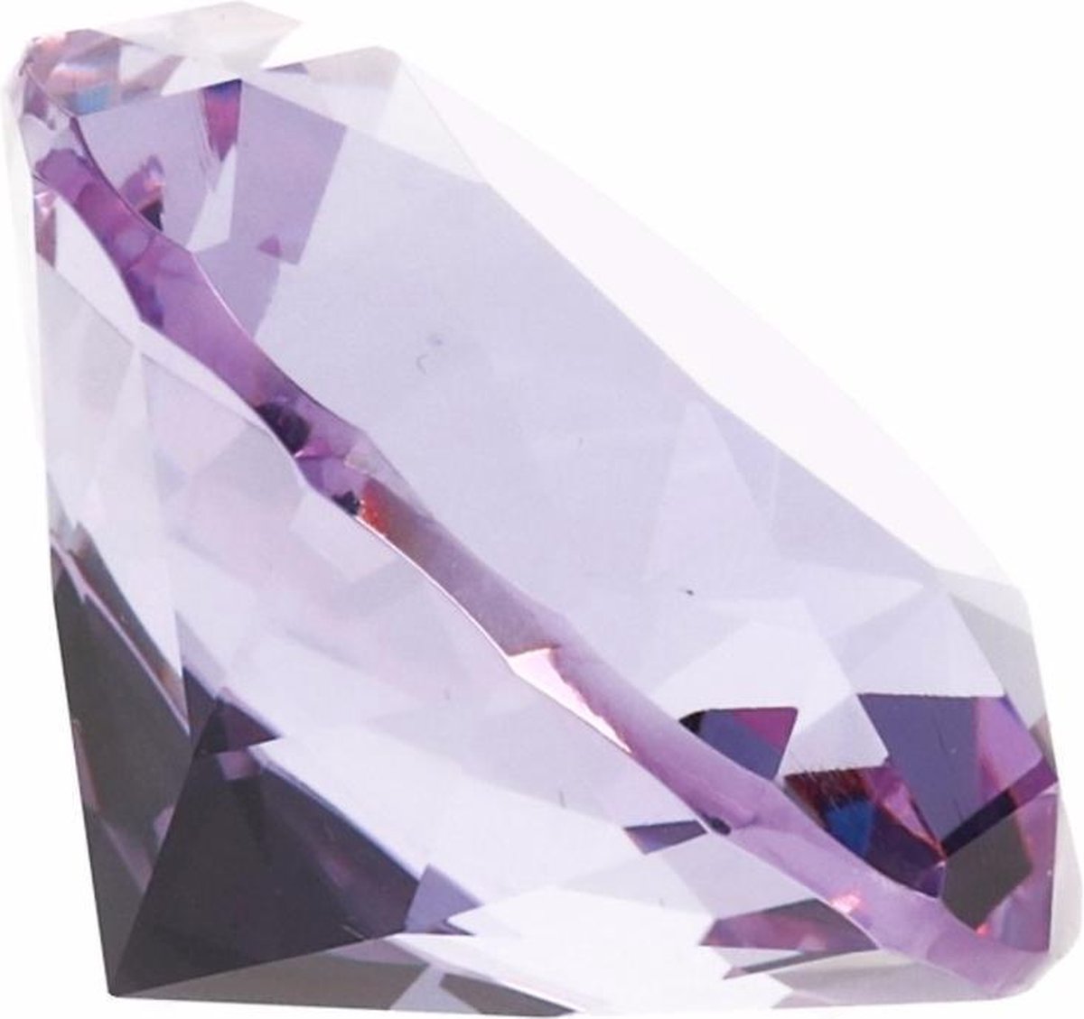 Lila paarse nep diamant 4 cm van glas. Decoratieve, glazen diamant in lila paars. Formaat diameter: ca. 4 cm, hoogte: ca. 4 cm. Materiaal: 100% glas.