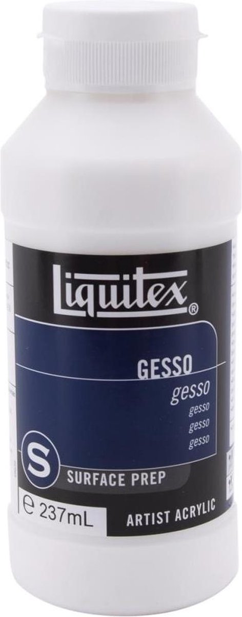 Liquitex-White Gesso. De klassieke witte sealer en grond voor absorberende oppervlakken, zoals canvas, papier of hout. Biedt de juiste oppervlaktelijming, tand en absorptievermogen voor acryl- en olieverf. Traditionele gesso is bedoeld als ondoorzichtig titaniumwit voor een goede dekking. Twee lagen worden aanbevolen onder olieverf. Pas het toe op onbewerkt canvas, hardboard, papier, hout en andere niet-olieachtige poreuze oppervlakken. Schuur harde, glanzende oppervlakken voor het aanbrengen. Kan getint worden met acrylverf maar mag niet gemengd worden met olieverf. Dit pakket bevat 237 ml Gesso. Voldoet aan ASTM D4236.