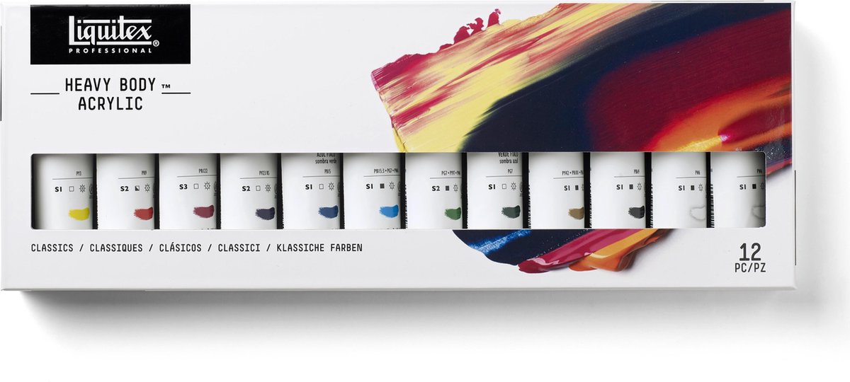 "De Heavy Body Acrylic Colour van Liquitex is een acrylverf van topkwaliteit met een zeer hoog gehalte aan pigmenten en een uitstekende helderheid en kleurkracht. Heavy Body heeft een stevige, boterachtige consistentie waardoor penseel- en messtreken scherp blijven staan en het de indruk van olieverf wekt. • Het hoge pigmentgehalte zorgt voor rijke, krachtige, permanente kleuren • Opmerkelijk geringe krimp • Na droging buigzaam – dikke lagen scheuren en bladderen niet • Weinig tot geen kleurverschil tussen natte en droge verf De verf is geschikt voor zowel traditionele technieken met penselen en schildersmessen als experimentele, gemengde, collage- en prent- of druktechnieken. Deze set van Liquitex bevat een collectie van 12 essentiële kleuren. Of je nu een beginnend of professioneel kunstenaar bent, met deze uitgebreide set kun je direct aan de slag om de mooiste kunstwerken te maken. "