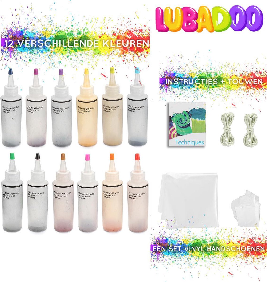De 12-kleuren Tie-Dye Kit zit vol met tonnen kleurrijk plezier! Gevuld met 12 flessen levendige kleurstof, 4 paar vinylhandschoenen en 40 stks elastiekjes en een inspiratiehandleiding, is deze kit klaar voor uw creativiteit. Wie wist dat stropdas verven zo gemakkelijk zou kunnen zijn? Technische specificaties: Materiaal: kleurstof Enkele fles Nettogewicht: 2,02 oz (57,3 g) Kleur: Donker paarsachtig rood, rood, oranje, geel, zuuroranje, groen, marine, donkerblauw, paars-blauw, paars-rood, bruin, zwart Dimensies: Bodem: 4 cm / 1.6 " Hoogte: 15,5 cm / 6,1 " Kenmerken en voordelen: a Kenmerken 12 gemakkelijk te knijpen flessen van sterk geconcentreerde niet-toxische kleurstoffen in populaire kleuren - voeg gewoon water toe om te activeren. b Het is niet nodig stoffen in soda-as te weken voordat ze dood gaan; voeg gewoon water toe om te activeren. c Inclusief stap-voor-stap techniekgids met meer dan 8 tie-dye-looks om uit te kiezen d Kleurstoffen zijn veilig om in de machine te wassen -