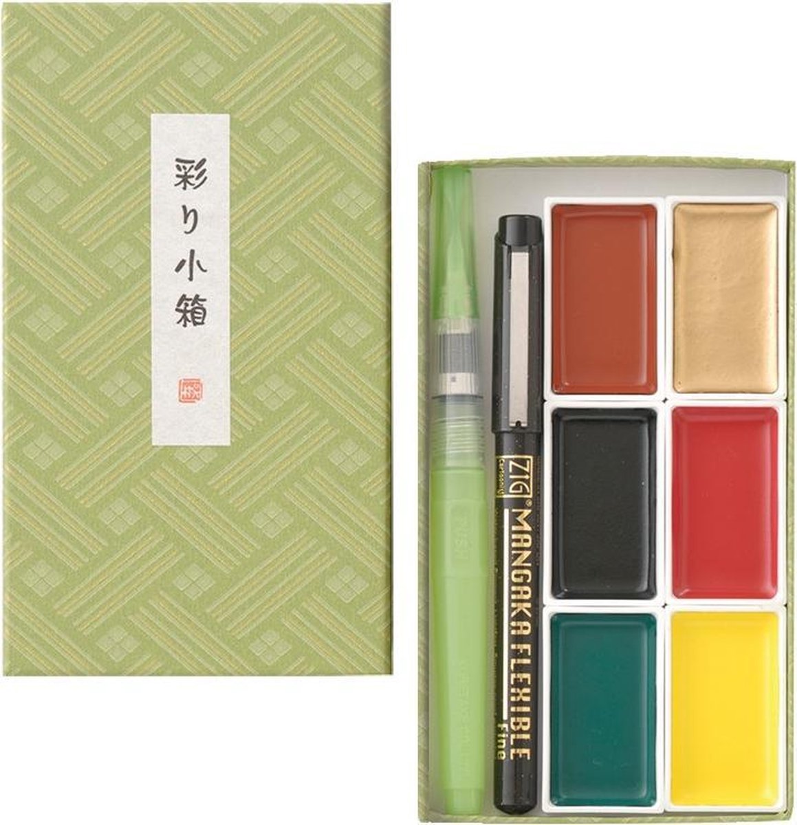 Gansai Tambi is een traditionele Japanse handgemaakte aquarelverf in een mooie verpakking. Bevat 6 kleuren, een waterbrush en speciale fineliner ( Mangaka flexible fine ). Traditionele Japanse handgemaakte aquarelverf in een mooie verpakking. Verpakking bevat langwerpige vlakjes met de meest mooie en levendige kleuren. pigmenten op waterbasis lichtecht niet giftig grote verfvlakken handgemaakt dekkend op donker papier of juist doorschijnend Gebruiksaanwijzing: werk met een waterbrush, voeg hiermee de gewenste hoeveelheid water toe op het kleurvlakje, dat groot genoeg is om te dienen als mengpaneel. breng meer water aan voor een doorschijnend effect met minder water en meerdere lagen bereikt u een dekkend resultaat geschikt voor schilderen in-en over stempelafdrukken, voor aquarelleren geschikt voor licht en donker papier