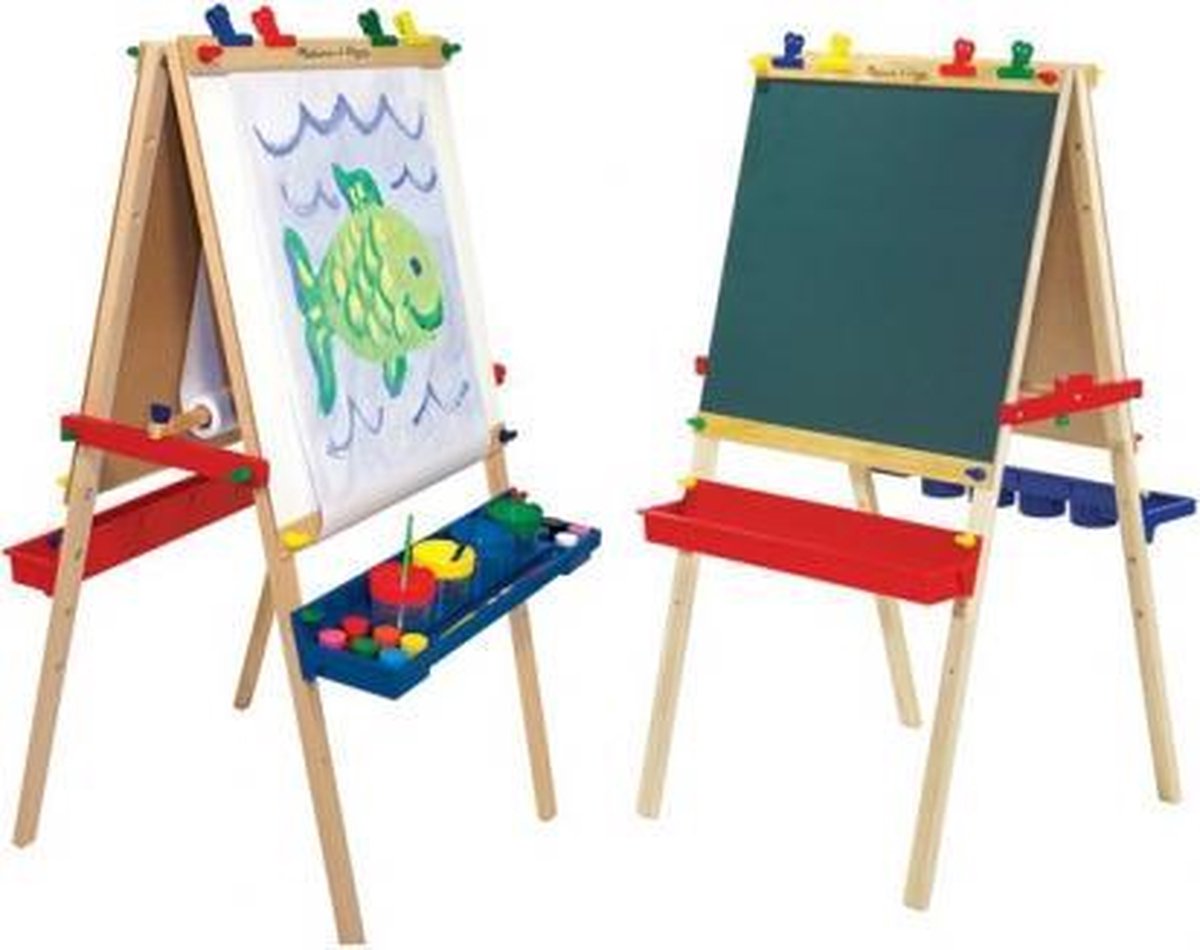 Luxe schildersezel voor kinderen. Dubbelzijdige en verstelbare schildersezel met krijtbord, whiteboard en de mogelijkheid om een papierrol te bevestigen. Opgezet is de ezel ongeveer 67 x 124 x 66 cm groot.