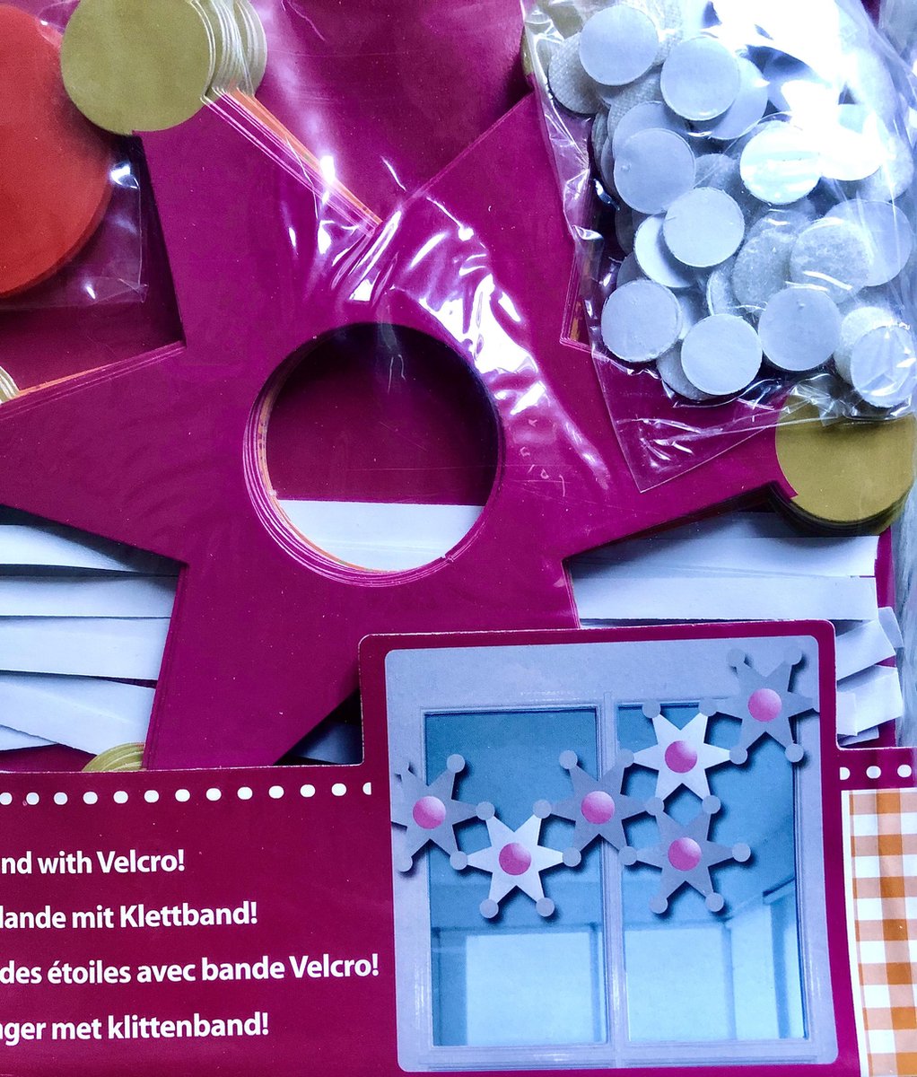 Maak je eigen sterrenslinger met klittenband Roze Inhoud: 30 sterren=15, 15x transparante folie, 100 klittenband rondjes, dubbelzijdig tape
