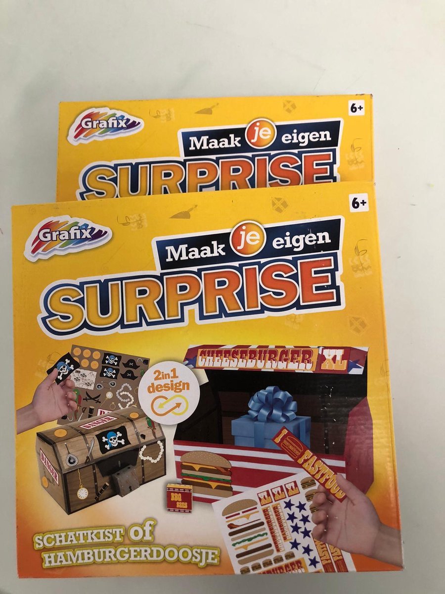 Maak je eigen suprise Set. Schatkist of humburgerdoosje. 2 stuks. Met stickervel, plakband en instructie vel